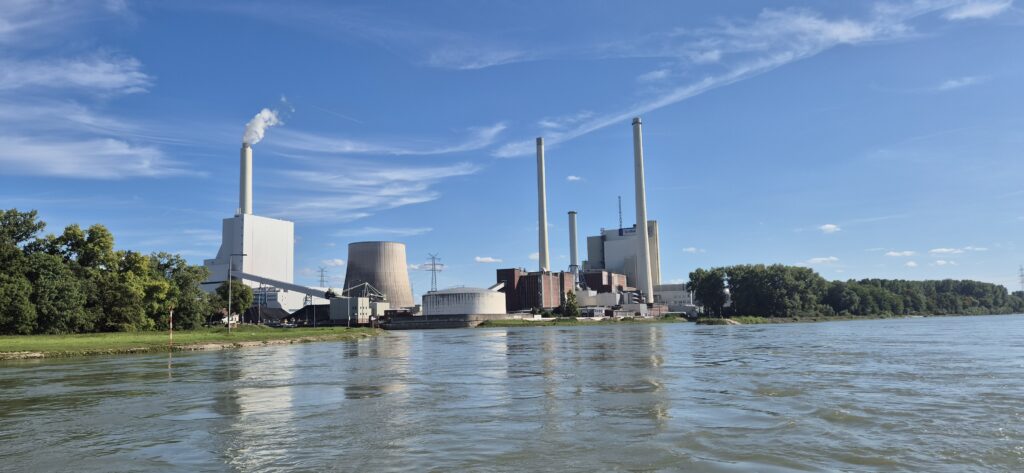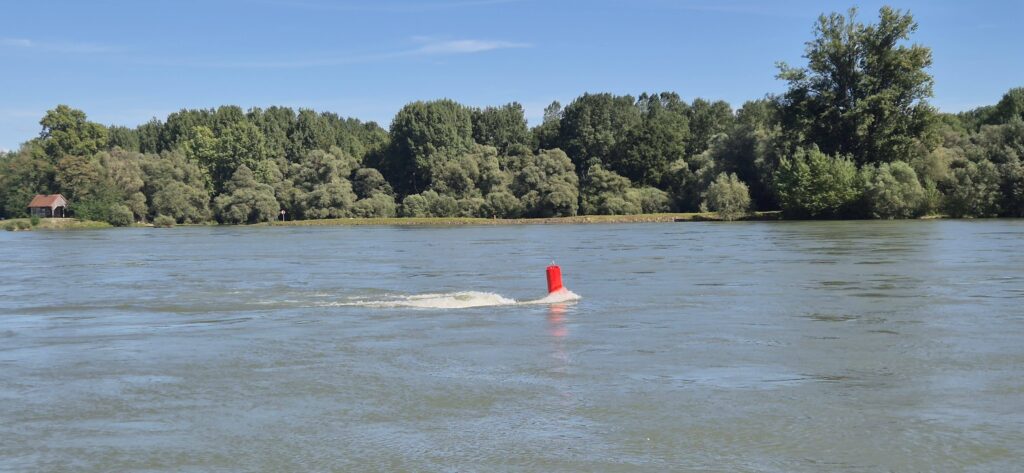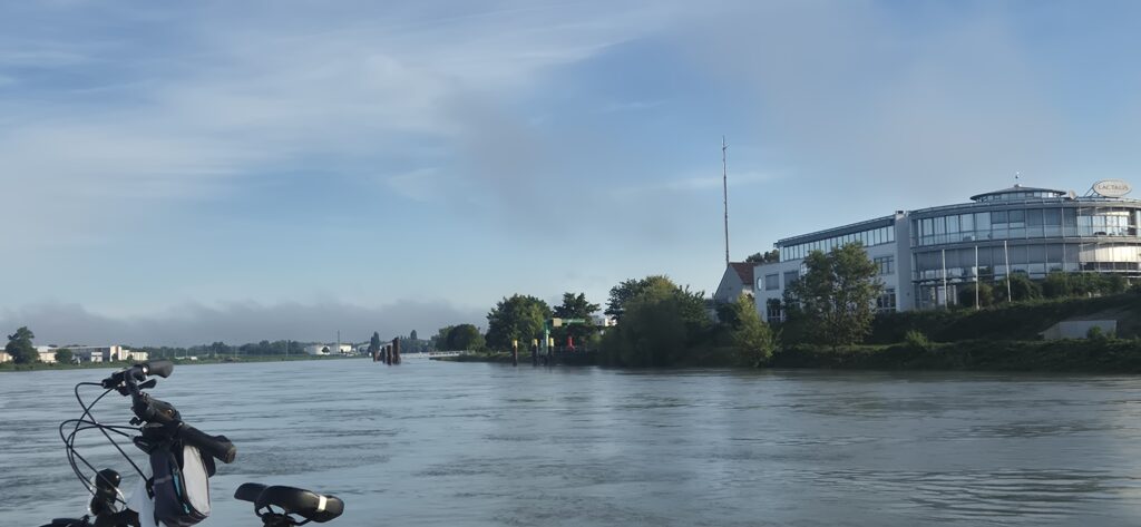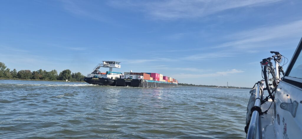 Plan był taki by wypłynąć o 8 ale nie wyszło. Załoga była gotowa, łódka też ale wszystko popsuła mgła. Wypłynęliśmy z osłoniętego portu, w którym mgły nie było widać i czym prędzej zawróciliśmy. Na Renie widoczność była na kilkadziesiąt metrów. Płynęliśmy chwilę w szybkim nurcie z prędkością 16 km/h a po zawróceniu do portu i zwiększeniu mocy silnika ledwo udało się uzyskać 4 km/h. Odczekawszy godzinę po opadnięciu mgły ruszyliśmy w trasę, która przy ostatnich przebiegach wydawała się nie do pokonania w jeden dzień. A jednak – prąd jest tak silny, że płyniemy z prędkością 17 km/h. Był nawet rekord 18,5.
