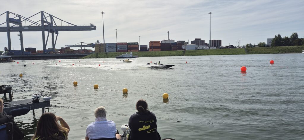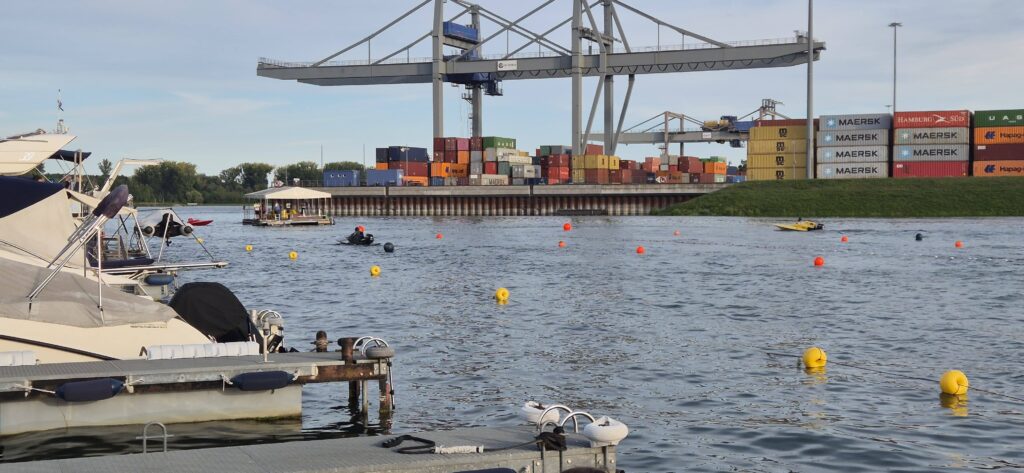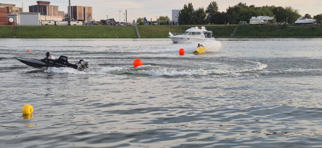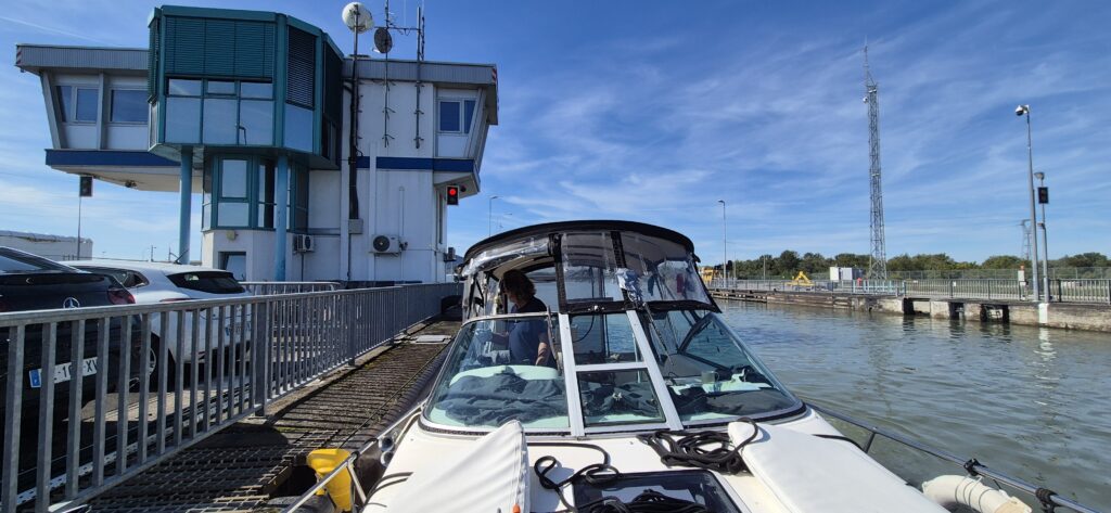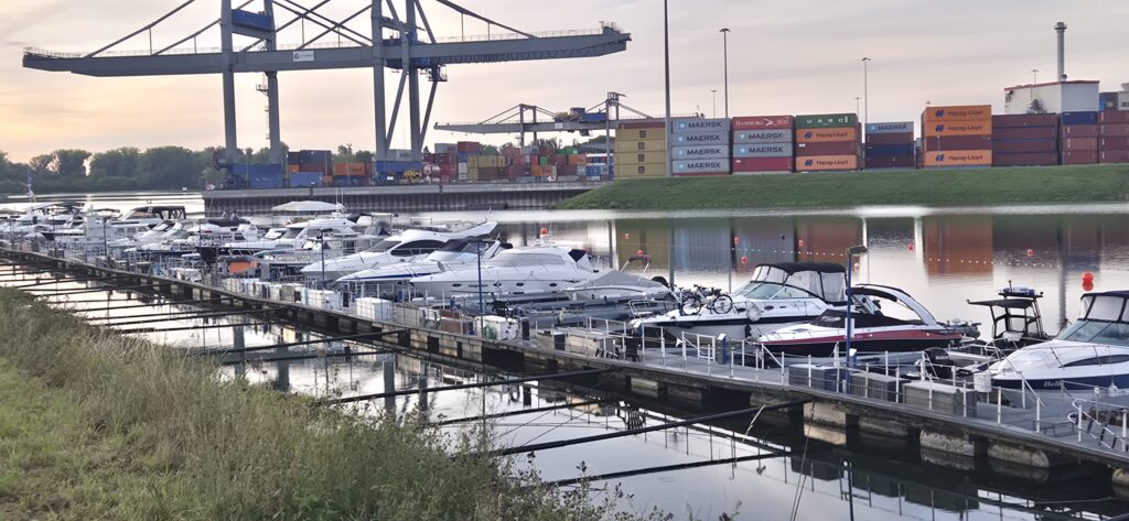 Cumujemy w porcie należącym do klubu sportowego Germersheim i trafiamy na Mistrzostwa Niemiec w Match Race MS11 czyli taką wodną Formułę 1. Port jest sporych rozmiarów, ma szerokie wygodne pomosty, dostęp do prądu i wody, postój kosztuje 17e. Okolica jest raczej portowo-przemysłowa. Zawody trwają do 20 a później zabawa przenosi się do małego budynku klubowego.