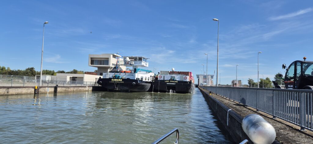 Mamy do przejścia dwie olbrzymie śluzy i tracimy na ich pokonanie 2,5 h. Baseny mają wymiary 270×24 m, więc samo napełnianie trwa bardzo długo a dodatkowo musimy ustąpić pierwszeństwa olbrzymim barkom. Niestety na Renie nie ma pontonów dla małych łodzi więc czekając cały czas musimy się kręcić przed wrotami. Dziś nie było na śluzach tak pięknie jak wczoraj.