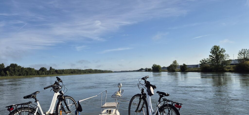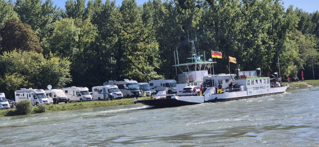 Jest sobota, dopisuje piękna pogoda i na rzece pojawia się sporo łodzi turystycznych. Nie maleje ruch komercyjny i co chwilę mijają nas duże barki. Po wyjściu z drugiej śluzy d’Iffezheim rozpoczyna się dosyć trudny nawigacyjnie odcinek Renu. Tor jest momentami mocno zwężony, po obu stronach rzeki znajdują się progi regulujące rzekę widoczne tylko w nawigacji. Barki, które mijamy mają wystawione specjalne niebieskie tablice, które informują nas, że mamy je wymijać „niestandardowo” prawą burtą. Jest spory wiatr, ponad 20km/h i trzeba szukać bojek nawigacyjnych. Rodan ze swoimi wysokimi czerwonymi i zielonymi słupami jest nawigacyjnie idealny.