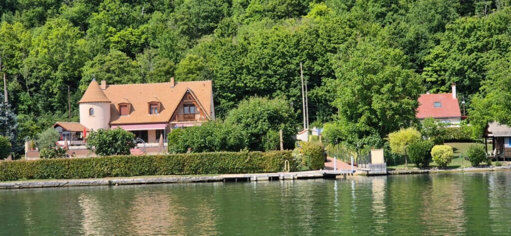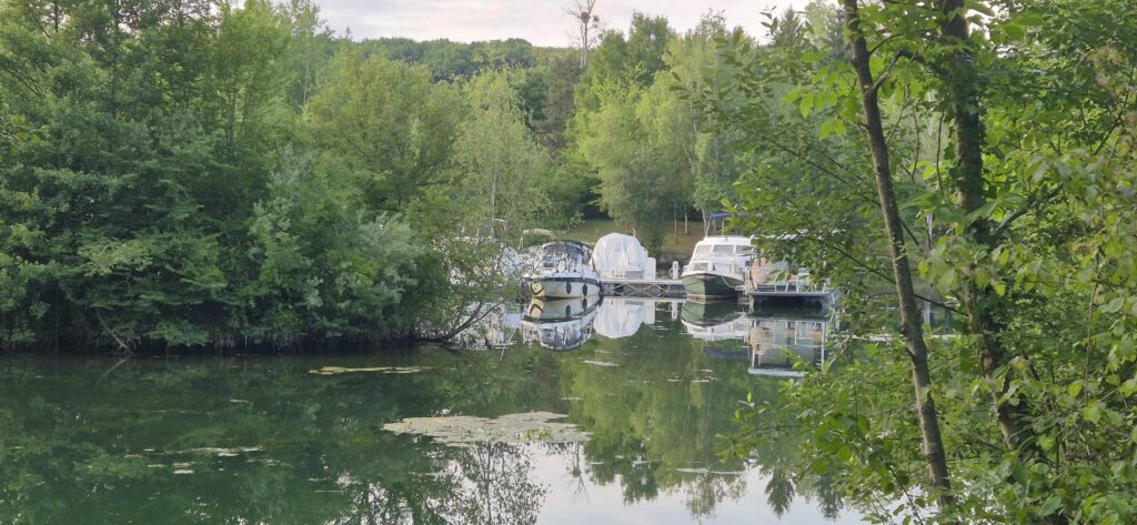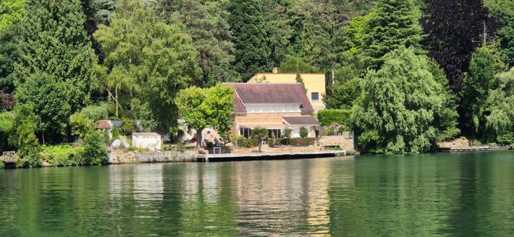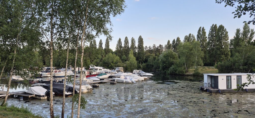 Krajobraz zmienia się po przepłynięciu 40 km. Wzdłuż Sekwany stoją piękne letnie rezydencje z zadbanymi ogrodami, zaczyna się też ruch turystyczny na wodzie. Port do którego płyniemy, oznaczony na mapie jak „przystanek rzeczny” nie oferuje zbyt wiele. Nie ma nikogo z obsługi, więc cumujemy i podłączamy prąd. Ku naszej radości jest. Jest bramka, na tą chwilę otwarta więc mamy nadzieję, że nikt jej nie zamknie bowiem kodu nie mamy a Ajra zostałaby w ten sposób pozbawiona toalety. W porcie stoi sporo mocno zaniedbanych łodzi, płytsza część jest prawie całkowicie zarośnięta. Liczyliśmy, że za Paryżem będzie lepiej jeśli chodzi o mariny ale nic na to nie wskazuje. Powoli tracimy nadzieję.