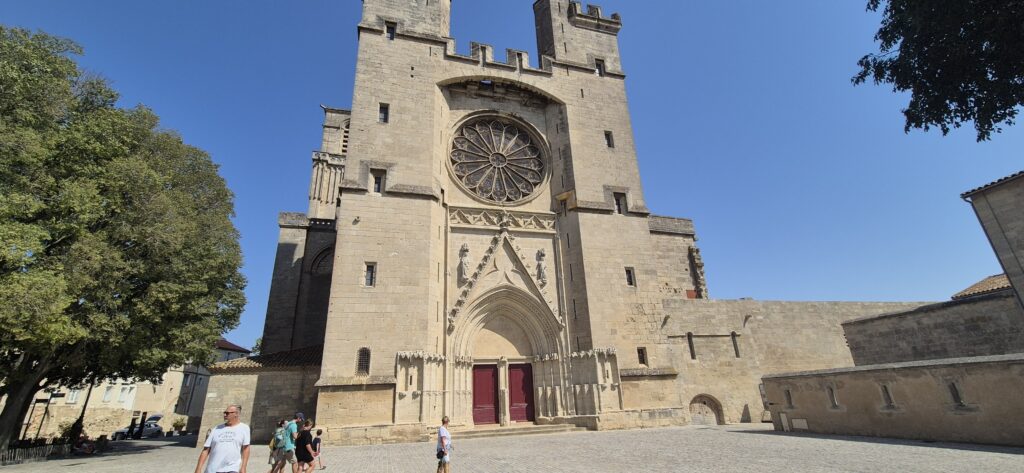 Nad miastem króluje katedra Saint-Nazaire. Z przylegającego trasu rozciąga się wspaniały widok na dolinę rzeki Orb i kanał. Tuż obok katedry znajduje się urokliwy plac z malutką restauracją w cieniu platanów. Mimo sporej ilości wolnych stolików przycupnąć nie można – stoliki czekają na wieczornych gości, którzy przybędą na kolację o godzinie 19. Z ekonomicznego punktu widzenia jest to pozbawione sensu bowiem przez dwie godziny restauracja mogłaby obsłużyć jeszcze wielu klientów, zarabiając tylko na napojach czy deserach. Siadamy zatem w pobliskim Bistro la Prison które ma dwie wspaniałe atrakcje: klimatyzację oraz fantastyczny widok na całe miasto.