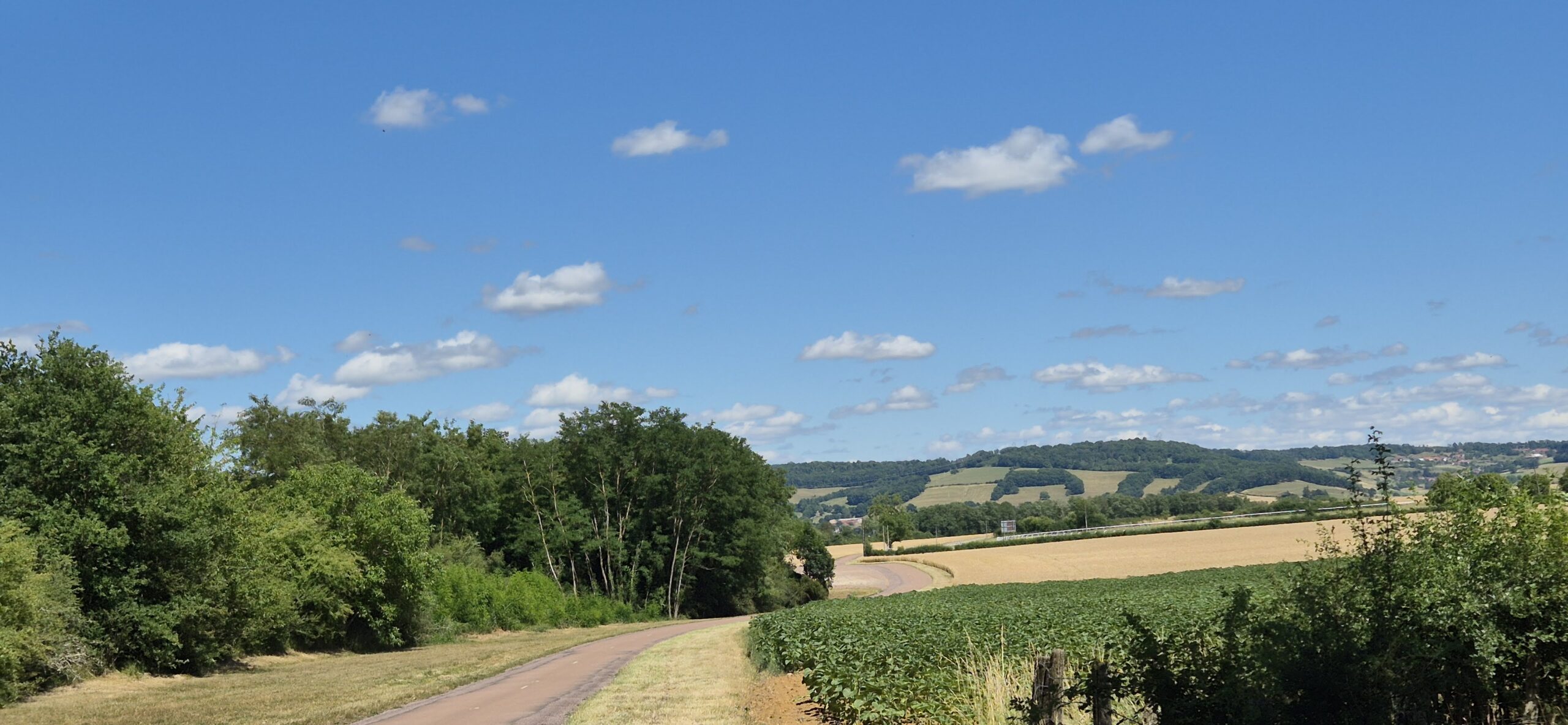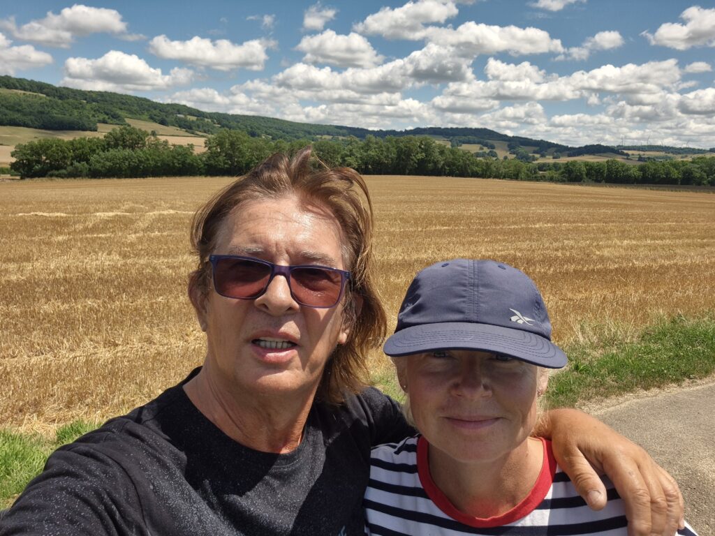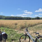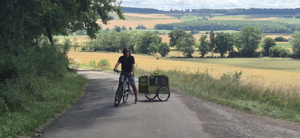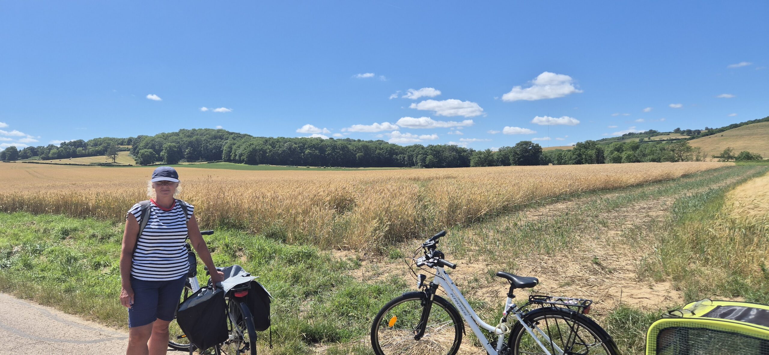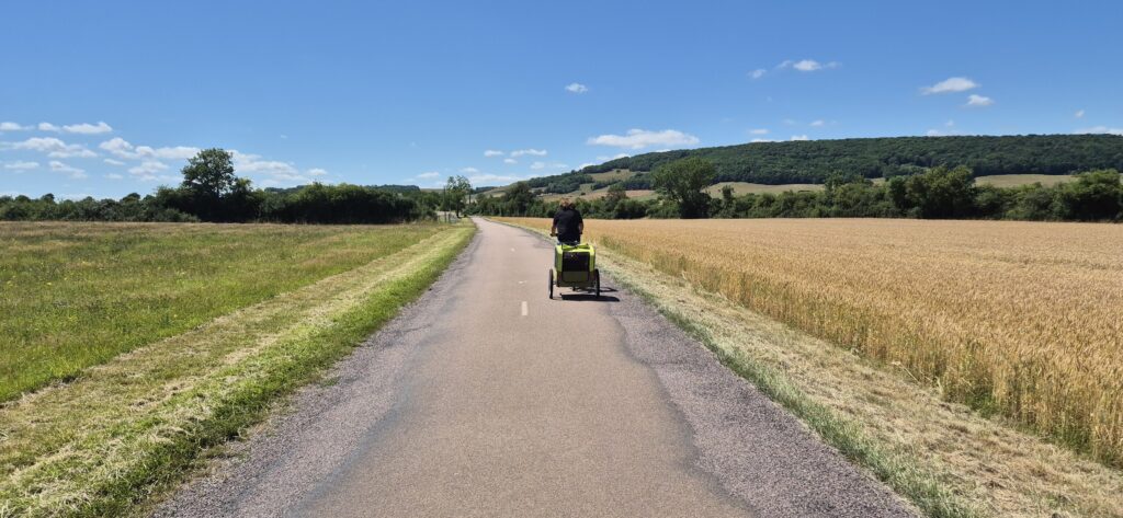Piękna droga wśród pól cały czas pnie się do góry. Kapitan ma na doczepce wózek z Ajrą a na termometrze ponad trzydzieści stopni, majtek nie ma doczepki ale sapie. Jak powszechnie wiadomo rower nie jest naszym głównym środkiem transportu w codziennym życiu więc brak kondycji jest szybko odczuwalny. Podziwiamy więc widoki a na stromych wzniesieniach po prostu pchamy rowery.