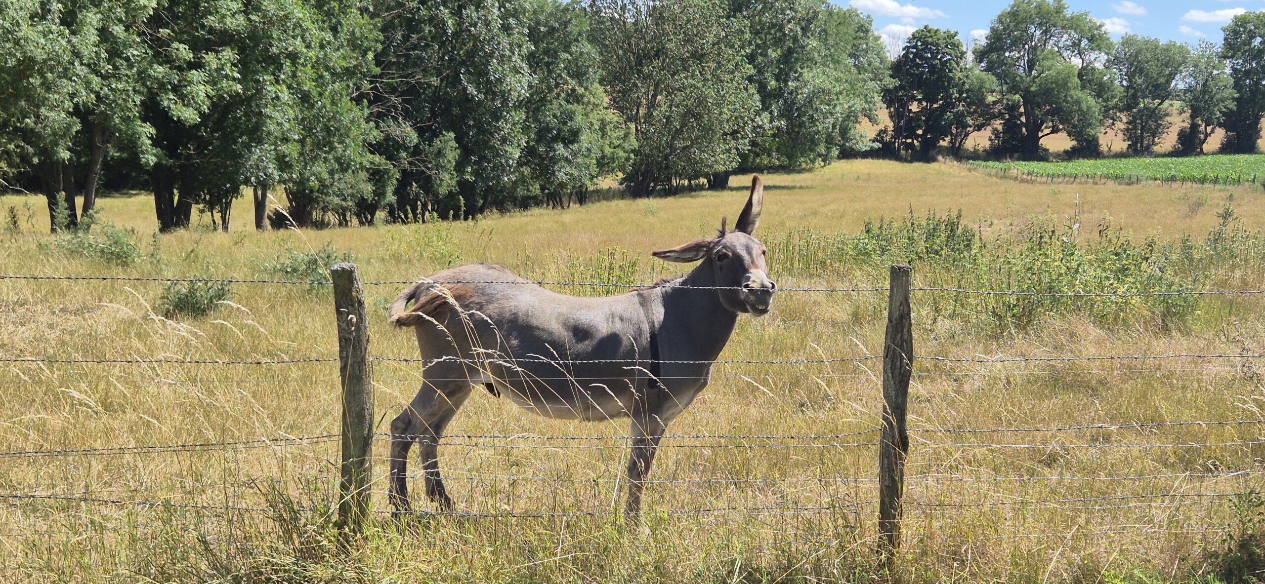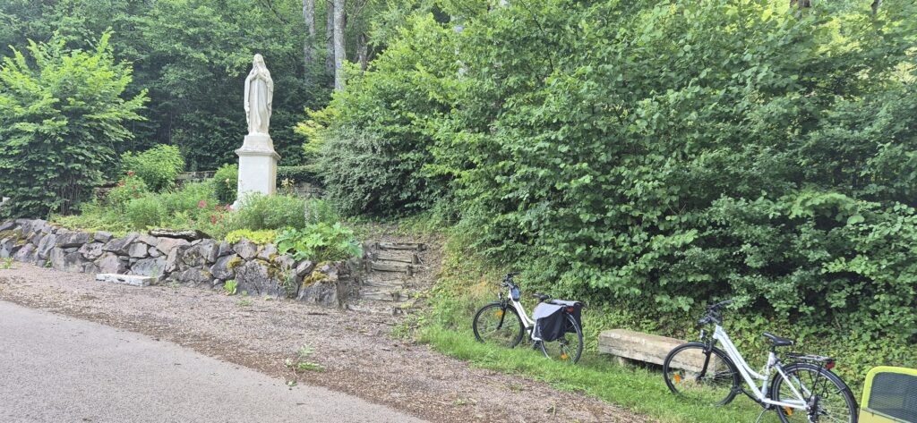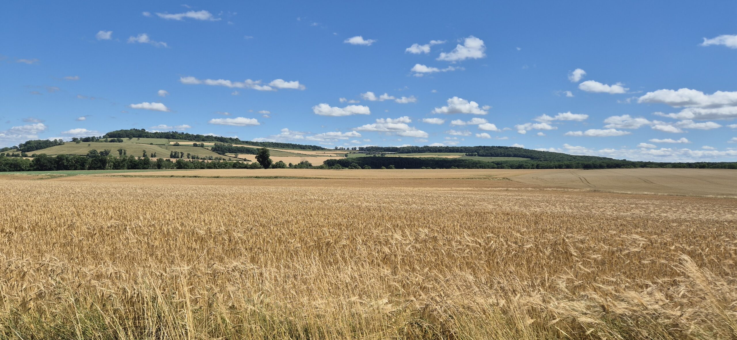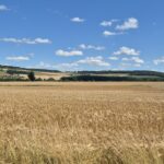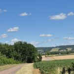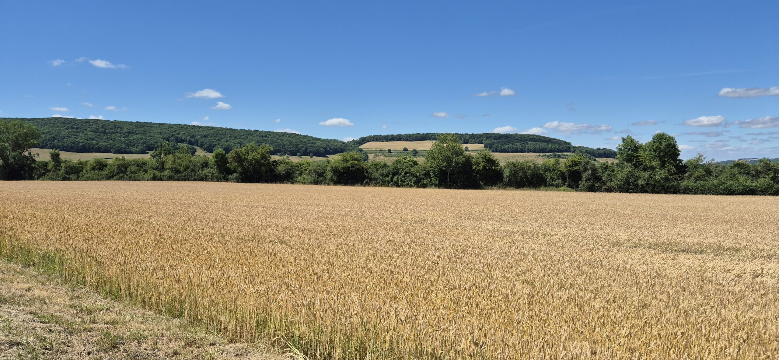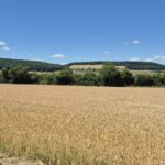 Piękna droga wśród pól cały czas pnie się do góry. Kapitan ma na doczepce wózek z Ajrą a na termometrze ponad trzydzieści stopni, majtek nie ma doczepki ale sapie. Jak powszechnie wiadomo rower nie jest naszym głównym środkiem transportu w codziennym życiu więc brak kondycji jest szybko odczuwalny. Podziwiamy więc widoki a na stromych wzniesieniach po prostu pchamy rowery.