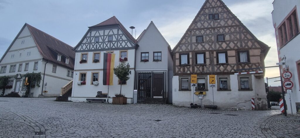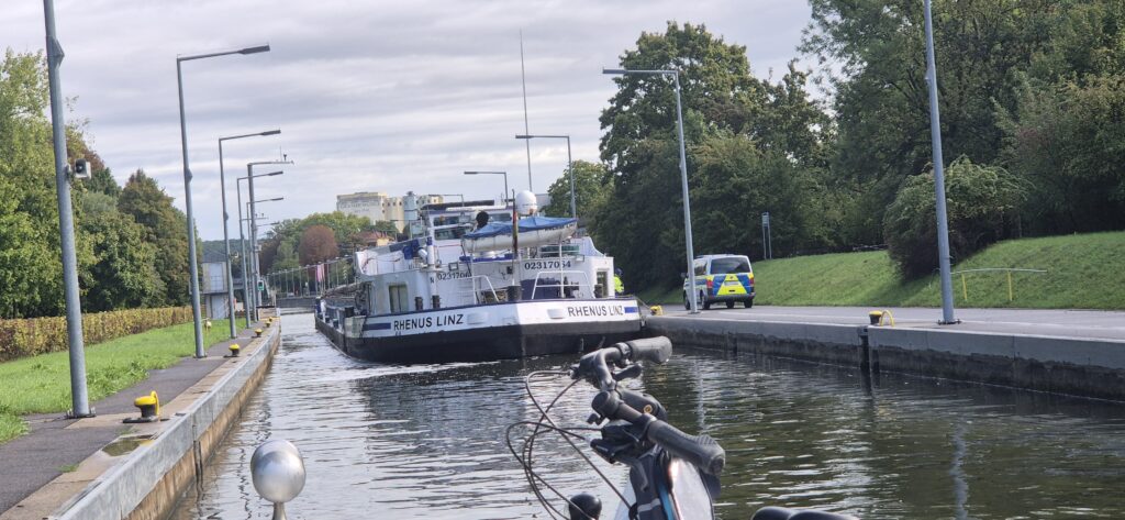Zaczynamy kolejny dzień w strugach deszczu i znowu nie mamy szczęścia na śluzach. Na pierwszej tego dnia tracimy godzinę bo mimo, że jest przygotowana operator każe nam czekać na barkę. Nie ma miejsca postojowego – jak zresztą na wszystkich śluzach na Menie- więc trzeba się kręcić przed wrotami. Kolejne przejścia spowalniają nam kontrole policyjne barek i tak straciwszy sporo czasu podejmujemy decyzję o skróceniu trasy i noclegu w marinie w Eltmann a nie w Bambergu.