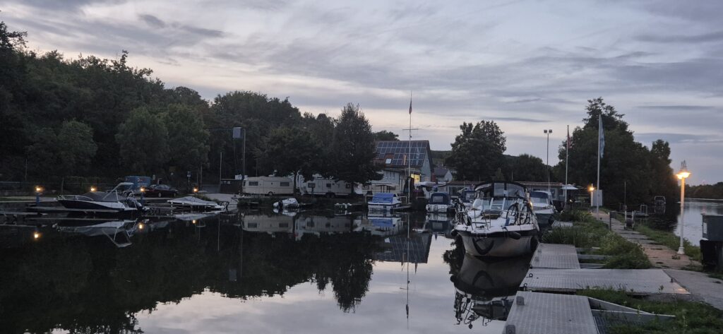 Udaje nam się zatankować Hooka bo na przeciwległym brzegu mariny znajduje się ponton oraz stacja Aral. Kapitan wykonuje dwa kursy z kanistrami i po chwili jesteśmy już w porcie. Marina jest pięknie zagospodarowana, oprócz miejsc postojowych dla łodzi są ładne parcele z przyczepami. Obowiązuje kopertowy system płatniczy, przez telefon otrzymujemy tez instrukcje gdzie znajdują się klucze do bramki. Bardzo jesteśmy podbudowani tą wiarą w uczciwość ludzi. Za prąd, wodę i czyste sanitariaty płacimy 20 e – w kopercie rzecz jasna.