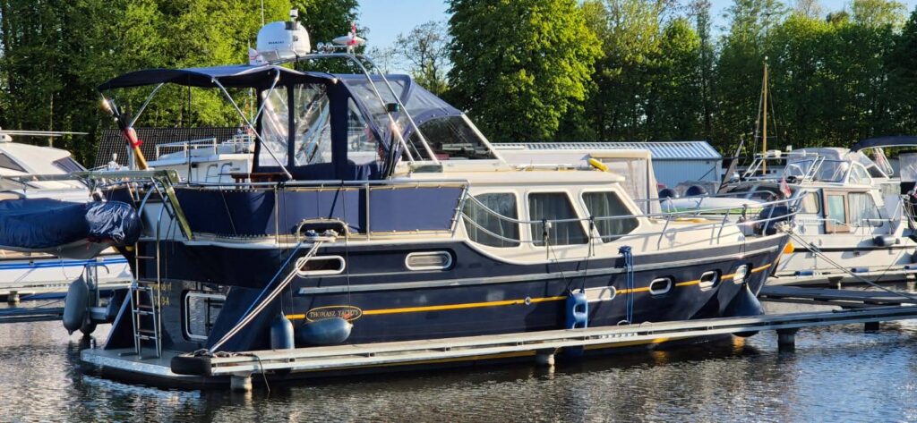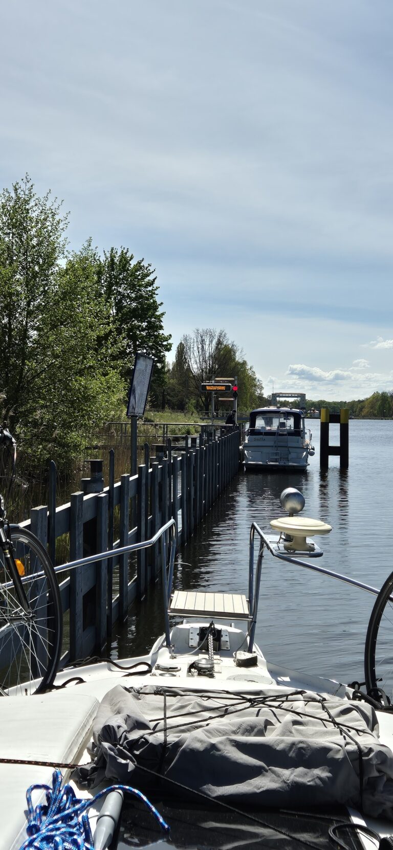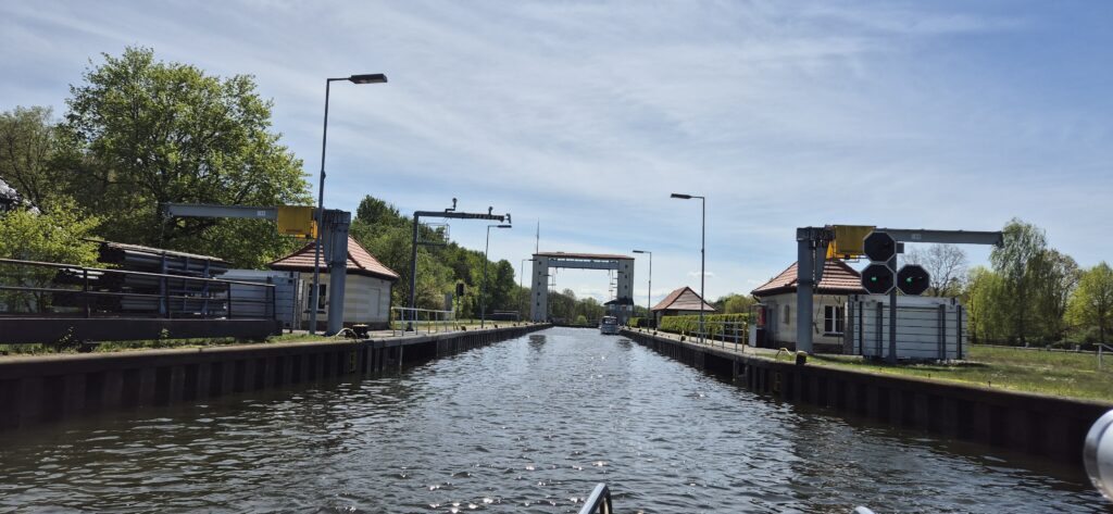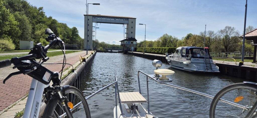 Do śluzy Lehnitz przypływamy o godzinie 12 i podobnie jak wczoraj jesteśmy w poczekalni sami. Dzwonimy do obsługi, zgłaszamy naszą chęć przejścia śluzy i … czekamy godzinę. Na końcu pomostu znajduje się specjalna budka z głośnikiem, gdzie również można zgłosić swoją obecność. Ponieważ jesteśmy szczęśliwymi posiadaczami starlinka i internet jest z nami cały czas, umilamy sobie ten czas słuchając podcastu. Dzisiaj Bogusław Wołoszański odkrywał przed nami tajemnice Mata – Hari. Tuż przed 13 pojawia się jeszcze jedna łódka i po chwili zapala się zielone światło.