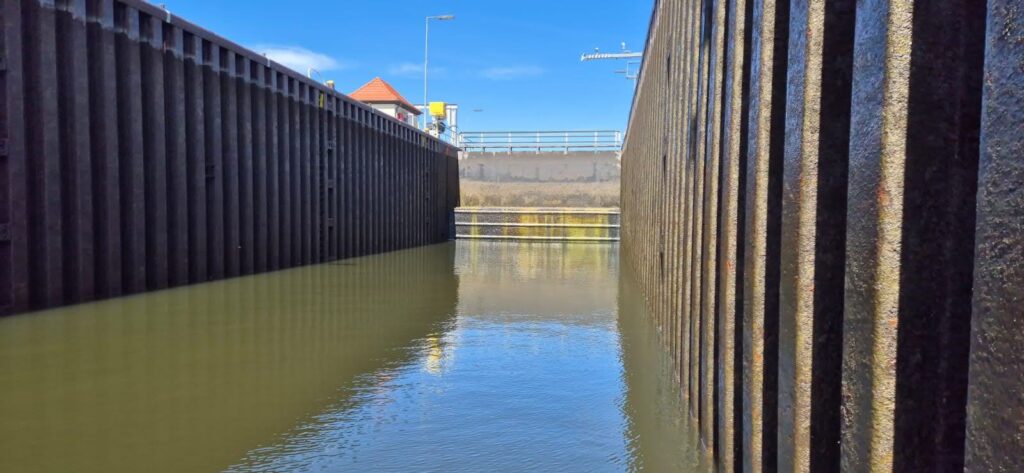 Wpływamy do komory i po chwili zaczynamy opadanie w dół – na oko kapitana będzie jakieś 8 metrów. Komora ma długość 125 m a szerokość wynosi niecałe 12 m. W niemieckich śluzach sznureczków nie ma, trzeba się mocować do polerów najlepiej w środkowej części burty. Z tej okazji majtek otrzymał do obsługi nową 20 m cumę. Cały proces przebiega bardzo spokojnie i po chwili wrota się otwierają.