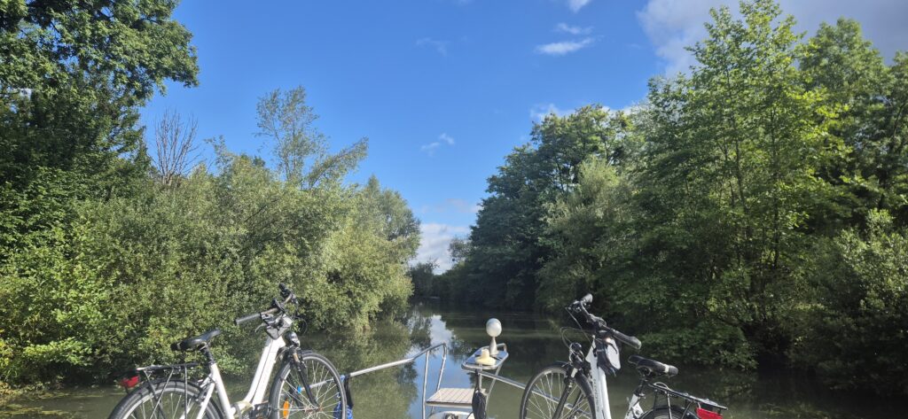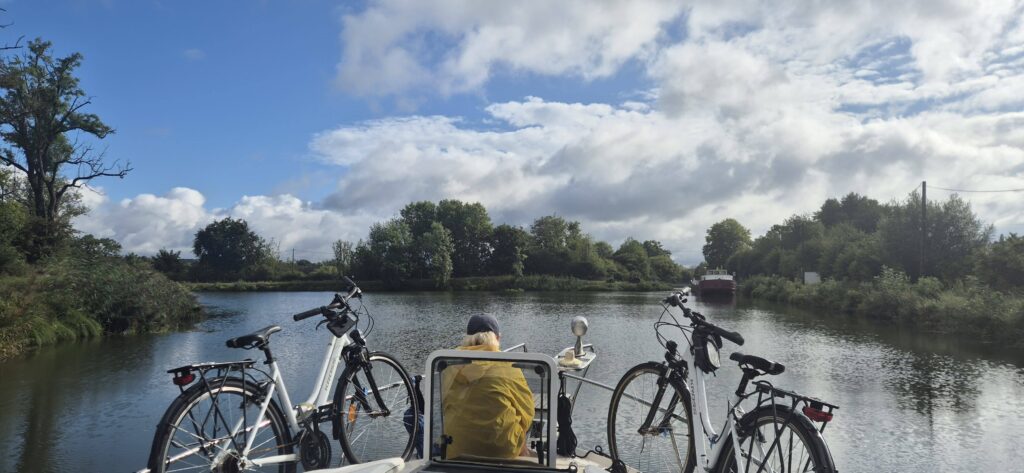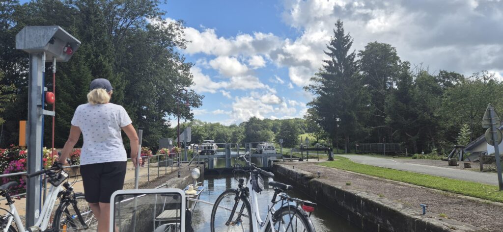 Jutrzejszą przeprawę również powinniśmy zgłosić telefonicznie do 15 (o czym nie wiedzieliśmy). Założyliśmy, że tak jak na kanale Burgundzkim ustalimy to z pracownikiem śluzy pod koniec dnia. Na szczęście robi to za nas pracownik VNF i ustala, że przeprawę zaczniemy jutro o godzinie 10 a towarzyszyć nam będzie mała, niemiecka łódka.