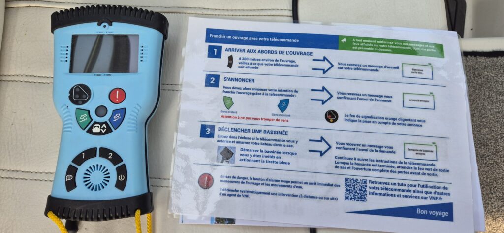 Pilot wygląda inaczej niż poprzedni, jest w czarnej walizeczce, ma nawet ładowarkę. Czytamy instrukcję, wszystko wydaje się proste więc płyniemy. Przy kolejnej śluzie nabieramy wątpliwości, czy dobrze zrozumieliśmy pracownika VNF – mamy bowiem pilota i wiszącą rurę. Próbujemy rurą, działa więc wpływamy do komory. Według instrukcji uruchomienie samego procesu śluzowania jest możliwe albo poprzez pilota albo klasycznie poprzez niebieską wajchę. Przycisk nie działa, wajcha tak więc płyniemy dalej. I to by było na tyle, jeżeli chodzi o sprawną przeprawę. Na dzisiejszym odcinku odnotujemy jeszcze trzy awarie. Pilot nie chce z nami współpracować a nić porozumienia udaje nam się nawiązać dopiero na ostatniej śluzie którą pokonujemy w 14 minut. Komory dzisiejszych śluz są inne niż dotychczas mijane, mają bowiem pomosty, które się podnoszą bądź opadają a same ściany skośnie opadają do wody. Podobny system widzieliśmy w porcie w Delfzijl. System jest fajny ale jest jeden mankament – do pomostu może się umocować jedna duża łódź lub dwie małe.