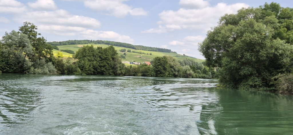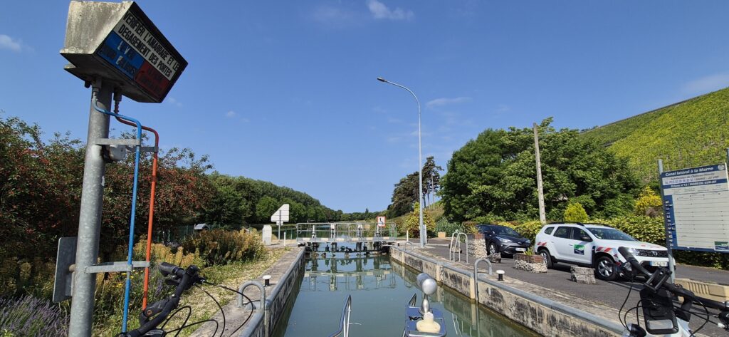 Wypływamy zgodnie z planem o 8.30, nie ma spania. Dzisiejsza trasa wiedzie przez Canal I’Aisne a la Marne, Kanal Lateralny Marny i Marnę. Mijamy bez problemu pierwszą śluzę, na obrotowym mostku otwieranym za pomocą wiszącej rury otrzymujemy od miłego Pana pilota, którym będziemy obsługiwali kolejne śluzy.
