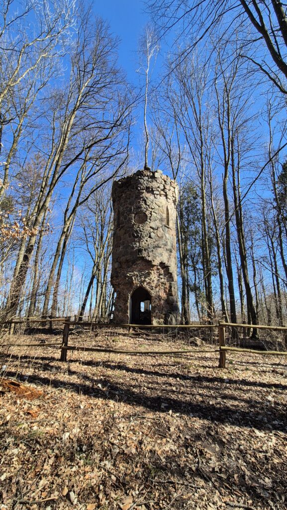 Kierujemy się w stronę Diablej Góry, która była ważnym dla mieszkańców miejscem – odbywały się tutaj uroczystości patriotyczne i zabawy. Na jej szczycie stoi kamienno – ceglana wieża (dzisiaj to już ruiny) tkz. Wieża Bismarcka z 1902 r. Tuż obok znajduje się pomnik wystawiony przez mieszkańców ku czci żołnierzy ze Srokowa biorących udział w bitwie, która miała tutaj miejsce w czasie I Wojny Światowej. Ze wzgórza roztacza się piękna panorama. Miejsce jest bardzo urokliwe więc warto się tutaj wdrapać a nie jest bardzo wysoko – zaledwie 156 m n.p.m.