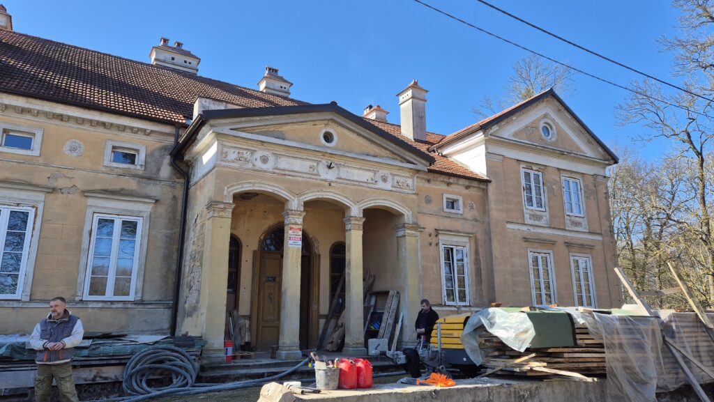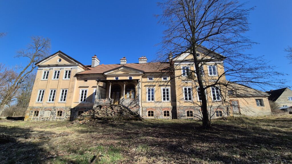 Jedziemy drogą wybrukowaną starą kostką i z każdym kilometrem mamy wrażenie, że tutaj świat się kończy. W Skandławkach znajduje się kilka popegeerowskich budynków i pałac zbudowany w 1844 r. Nic więcej. Zastajemy ekipę remontową oraz właściciela. Mamy zgodę na spenetrowanie otoczenia, robimy zdjęcia i wdajemy się w krótką pogawędkę. Remont pałacu z uporem utrudnia konserwator zabytków, przez ponad dwa lata nie można było podjąć żadnych prac remontowych. Na to wszystko nałożyła się pandemia. Smutne to, bowiem wiele budowli przez takie działania popada w kompletną ruinę. Nowy pan na włościach pochodzi ze Śląska więc umawiamy się na winko za trzy lata aby sprawdzić jak mu się wiedzie. Mocno trzymamy za niego kciuki. Nie dowiedzieliśmy się jakie plany ma wobec budynku ale z całą pewnością nowe życie pałacu to szansa na pracę dla nielicznych mieszkańców i wielka zmiana dla malutkiej wioski. Ten punkt wycieczki jest bardzo udany.