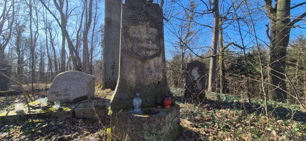 Kierujemy się na północ do kolejnego obiektu, który znajduje się w Brzeźnicy – dosłownie 400 m od granicy z Rosją. Dwór zbudowano w 1820 r., budynek oraz przyległy park zachowały się w dosyć dobrej kondycji. Klasycznie był tutaj PGR oraz gorzelnia. Nie weszliśmy na teren obiektu bowiem budynek jest zamieszkały. Przed wjazdem do wioski na małym leśnym wzgórzu po prawej stronie znajduje się cmentarz rodowy z pięknymi starymi nagrobkami. Jest odwiedzany przez potomków właścicieli o czym świadczą kolorowe kamyki i zapalone znicze.