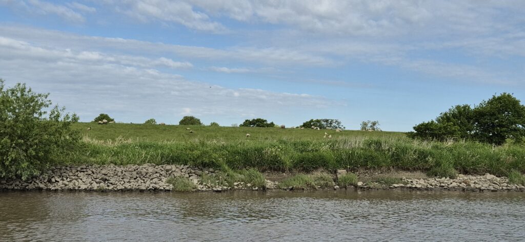 Przed nami długi 70 km odcinek do Holandii więc ruszamy już o 8 rano w stronę śluzy Herbrum. Przed wrotami nie ma żadnej poczekalni dla małych statków więc krążymy w oczekiwaniu na zielone światło. Czekamy na barkę, która ma pierwszeństwo i wpływamy tuż za nią do komory. Opuszczamy się w dół około metra, czyli mamy jeszcze przypływ bowiem różnica poziomów w śluzie wynosi 2,7 m. Była to ostania nasza schleuse w Niemczech. Zaraz po wyjściu ze śluzy głębokość rzeki jest zadziwiająco niska i wynosi jakieś 1,5-2 m. Po pokonaniu 8 km poziom podnosi się do 3-4 m, brzegi są porośnięte tylko trawą a woda ma kolor błota.