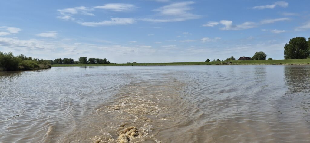 Po ok 30 km na wysokości Weener głębokość zwiększa się do 4-5, a szerokość rzeki do ponad 100 m. Płyniemy z coraz bardziej wartkim prądem a nasza prędkość wzrasta z 9 do11-12 km/h a pod koniec nawet do 14. To przy stałych obrotach silnika! To dowodzi, że szybkość nurtu w Ems wynosi nawet 5 km/godzinę. Będziemy zatem w porcie ponad 1,5 godziny szybciej. Pokonaliśmy tę trasę w niecałe 7 godzin. Jedną dodatkowo zmarnowaliśmy w śluzie.