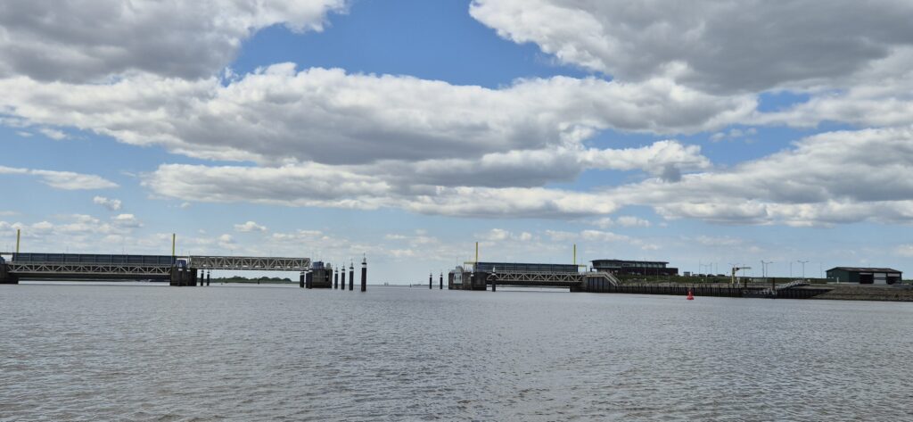 Przed samym ujściem w pobliżu Gandersum znajduje się jedna z najnowocześniejszych zapór wodnych w Europie. Konstrukcja o długości 476 m ma dwie funkcje: odbija fale sztormowe, które osiągają nawet 4 m a także umożliwia ruch statków o większym zanurzeniu poprzez spiętrzenie wody. Ma to szczególne znaczenie dla nieodległej stoczni w Papenburgu, gdzie produkowane są olbrzymie jednostki pasażerskie (takie statki miłości). Na wysokości zapory Ems ma już szerokość ok. 800 m a głębokość 8-9 m. Wokół na horyzoncie same wiatraki, które co tu ukrywać psują nieco krajobraz.