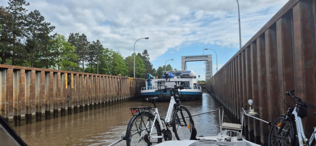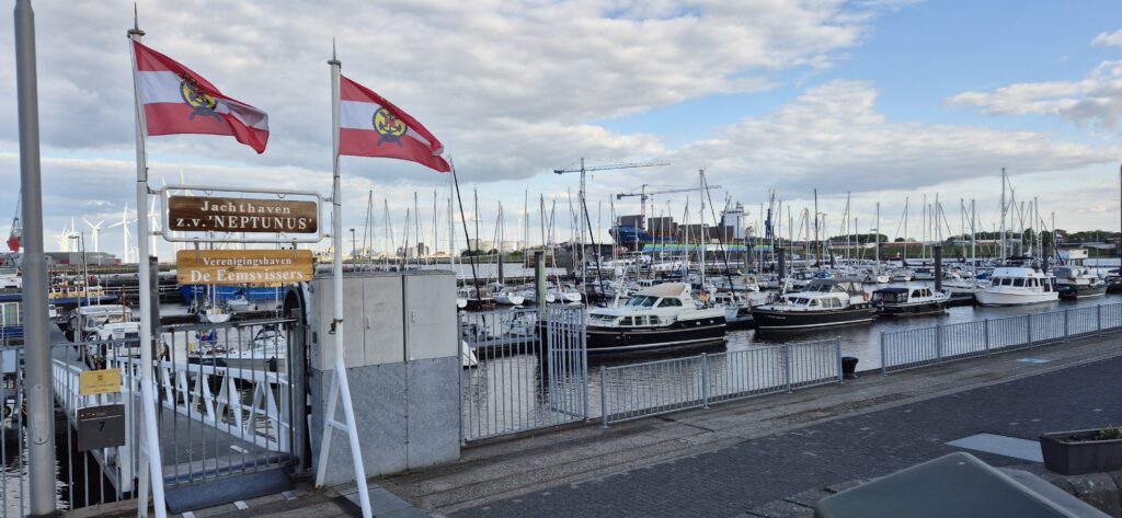 Na wodach zatoki pojawiają się już duże statki, a jak tak to jest też spora fala. Zmieniamy kurs i kierujemy się w stronę kanału prowadzącego do portu w Delfzij. Dalej już tylko otwarte morze Północne. Neptunus to duży port nazywany „bramą Holandii”, który ma stanowiska cumownicze dla 122 łodzi. Jest prąd, sanitariaty ale woda na pomoście nie nadaje się do picia. Śmietniki oraz bramka wejściowa na teren portu są na kody. Koszt cumowania to 23 e. Zastanawialiśmy się jak wygląda sytuacja z cumowaniem w obliczu pływów – otóż pomosty w porcie są ruchome. Wszystkie podnoszą się i opadają zgodnie z pływami. Od momentu kiedy zacumowaliśmy czyli od godziny 16 do 22 poziom wody wzrósł o 3 m! Siedząc na łodzi, jest to niezauważalne ale nasz wskaźnik głębokości jest niezawodny.