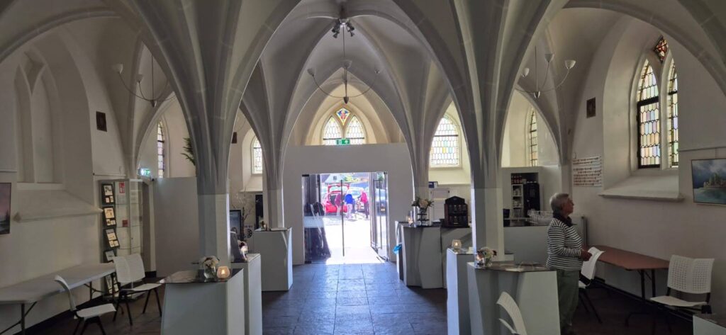 Podążamy na ulicę Klooster 1 gdzie kiedyś znajdował się kościół św. Katarzyny a obecnie w jego wnętrzach jest galeria i mini- barek To nie pierwszy kościół zamieniony na kafejkę. Zostawiamy bez komentarza choć chciałoby się coś napisać.