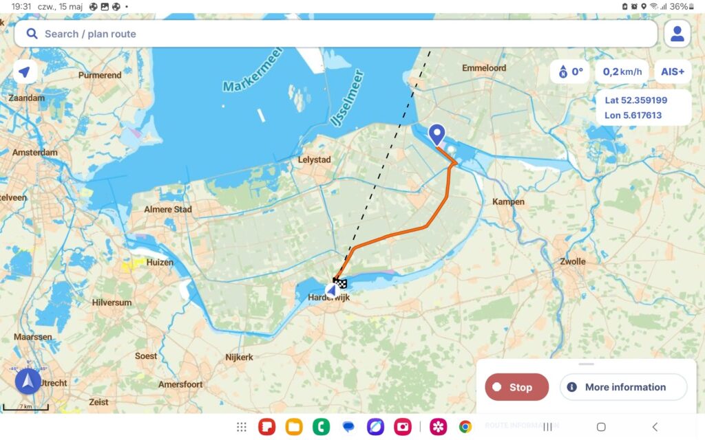 Urlop się skończył – czas płynąć. Dzisiaj do małego miasteczka Harderwijk, które stanowi ostatni przystanek przed Amsterdamem. Drogi do wyboru były dwie: przez morze i kanałem. Mimo, że w wersji „morskiej” dotarlibyśmy do celu szybciej podjęliśmy decyzję o trasie śródlądowej. Po wypłynięciu z portu mamy do pokonania mały odcinek przez Ijsselmeer i Werkhaven, następnie przez śluzę Urkersluis wchodzimy na kanał Hogevaart, którym dotrzemy do celu. Na terenie Holandii korzystamy z nawigacji Waterkaarten, która jest bardzo dobra a jej zakup nie rujnuje domowego budżetu bowiem kosztuje uokoło 200 zł na rok. Działa na dwóch urządzeniach, ma świetne opcje planowania trasy niezbędne informacje o portach, śluzach i mostach.