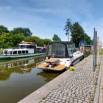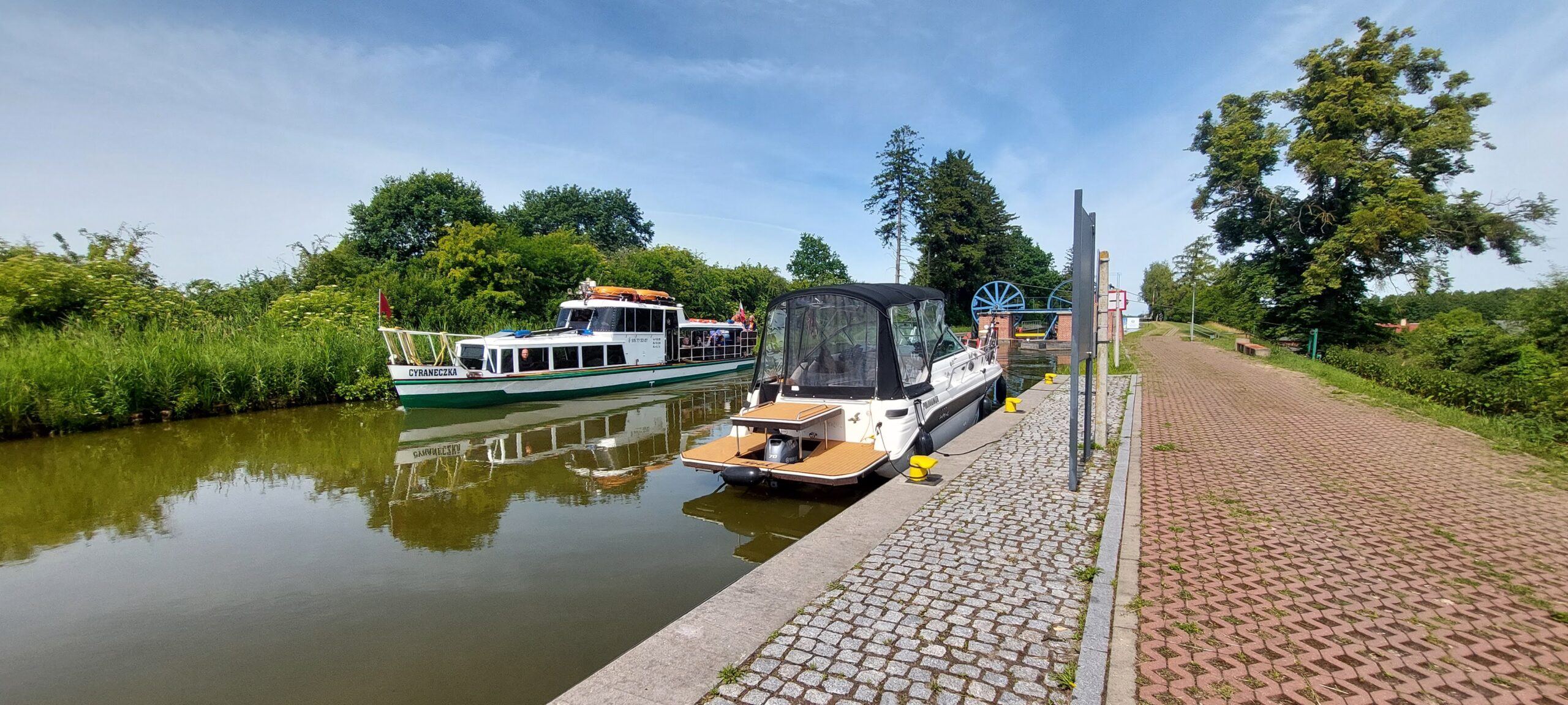 Mamy sporo szczęścia bo wypływając rano spotykamy się tylko z dwoma statkami białej floty na pochylniach i praktycznie nigdzie nie musimy czekać. Gdyby była taka potrzeba przed każdą pochylnią znajdują się miejsca do zatrzymania się, można na nich również nocować. Za pochylnią Oleśnica znajduje się obrotnica dla jachtów.