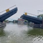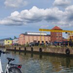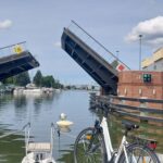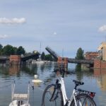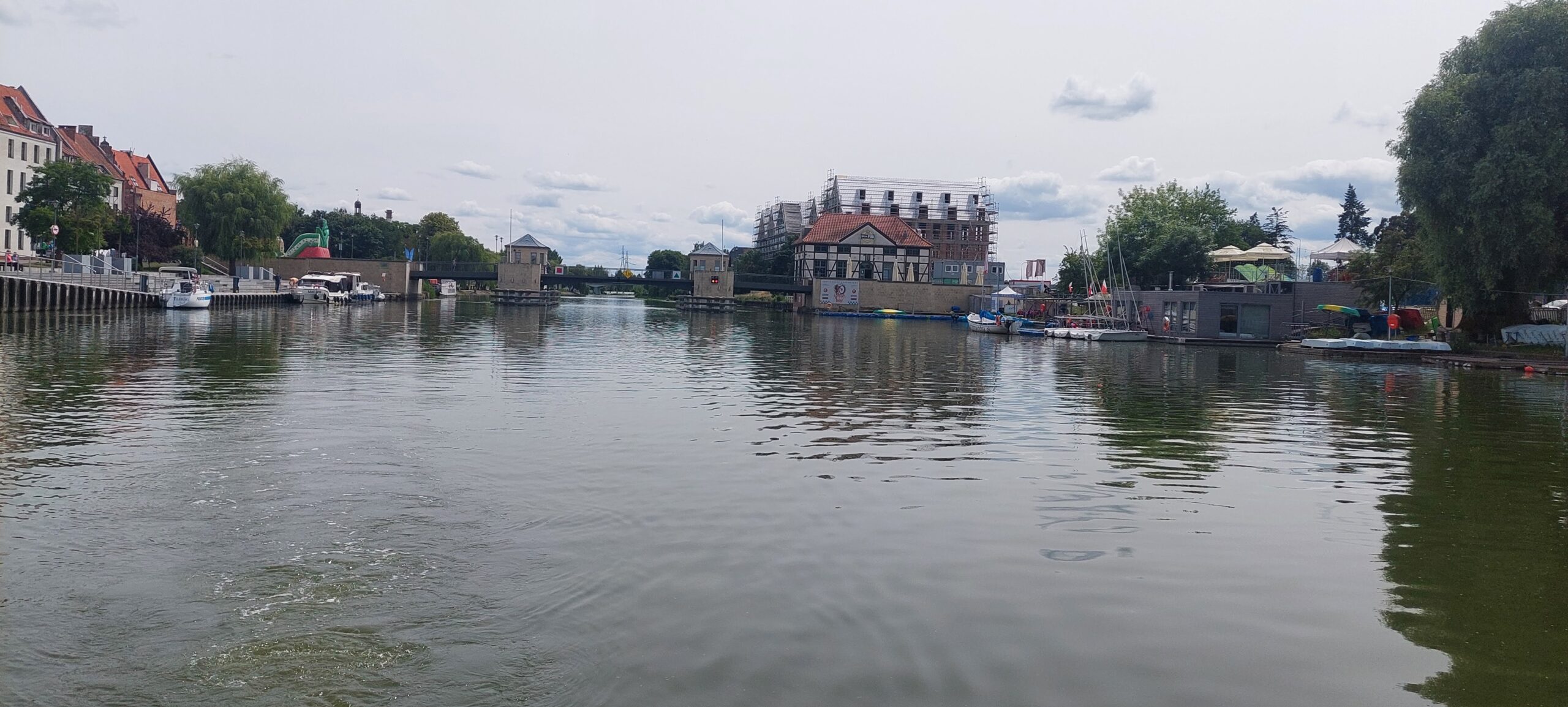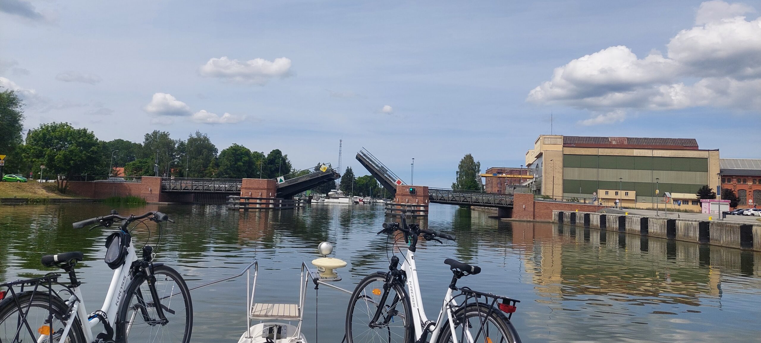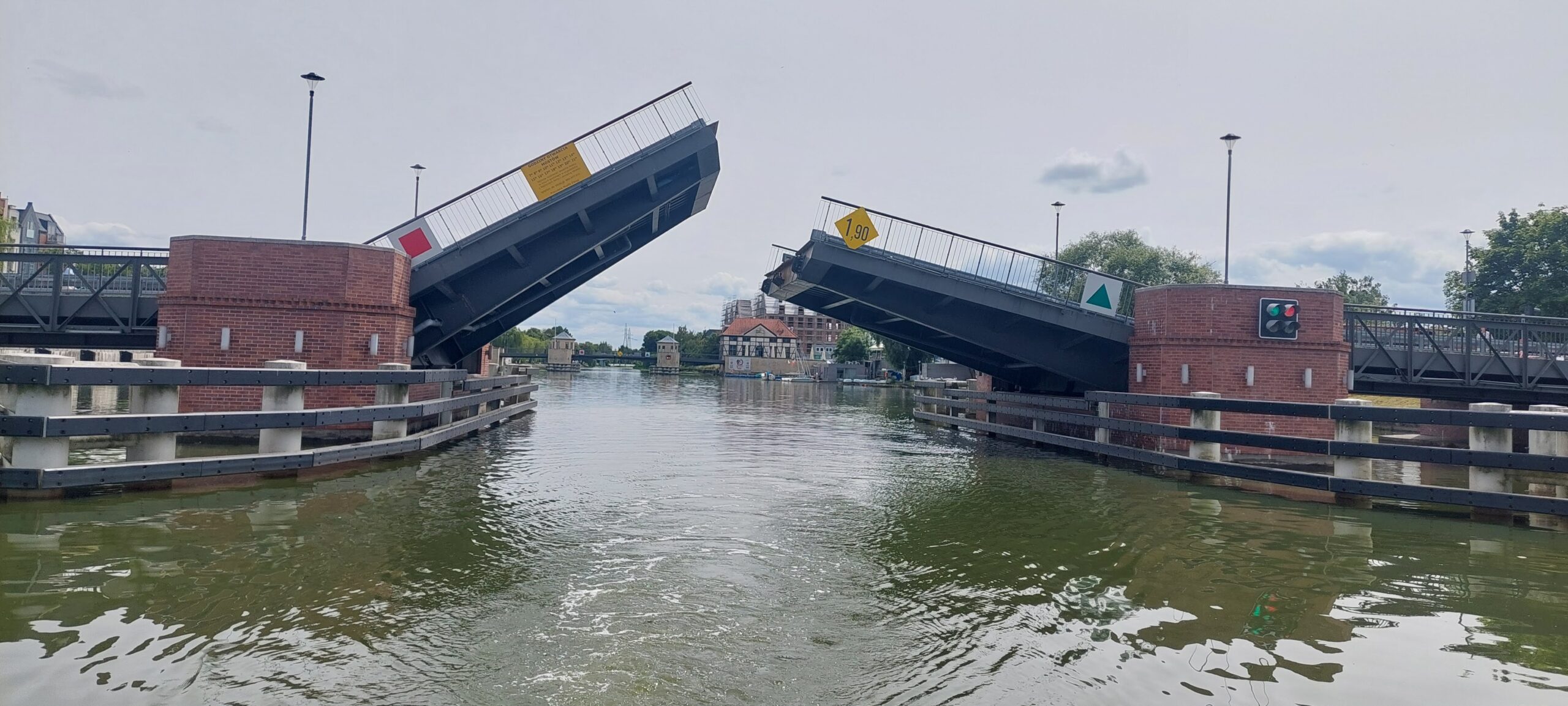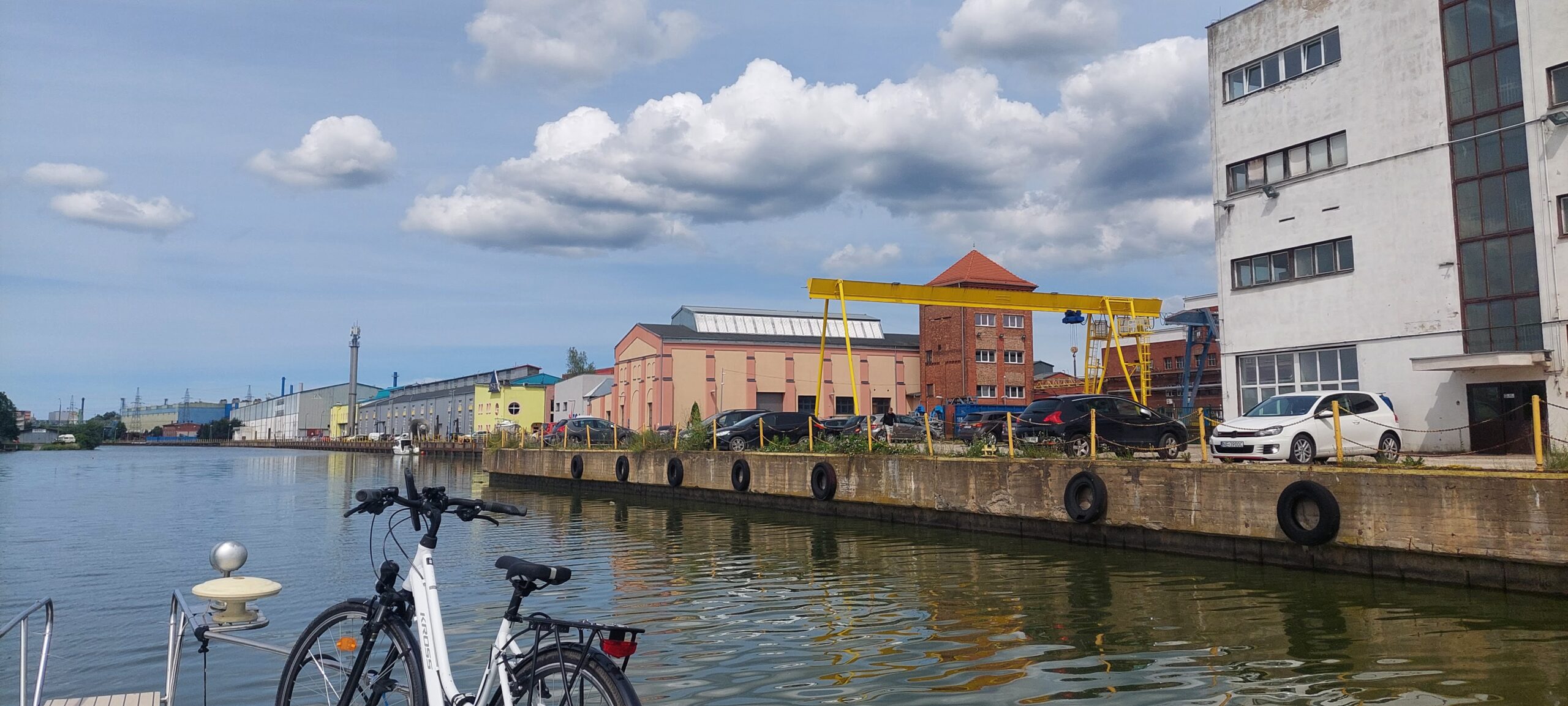 Ten odcinek ma ok 10 km a dalej zaczyna się rzeka Elbląg. Tu już jest wygodny szlak, 2-3 m głębokości. Zabudowa portowa sprawia trochę przygnębiające wrażenie za to bulwary prezentują się wyśmienicie. Mijamy Most Dolny bez problemu bowiem jego prześwit wynosi 2,8 m i stajemy na Bulwarach Zygmunta Augusta. Można tam również zostać na noc, w słupkach znajdują się łącza do wody i prądu, a kluczyki są u pana mostowego. W posiadanych materiałach mamy informację, że drugi most o prześwicie 1,8 otwiera się o godzinach nieparzystych od 7 do 21. Cumujący obok nas mówią, że mamy dzwonić i udaje się. Most zostaje dla nas otwarty, nie ma konieczności czekania. Do Jacht Klubu Elbląg docieramy o 14. Chcąc tutaj stanąć należy wcześniej zadzwonić do bosmana i ustalić czy będzie miejsce. Keje dla gości są po prawej stronie przy zielonych bojach, my jednak dostajemy wygodne miejsce przy Y-boom’ie z uwagi na Ajrę. Opłata za Hook’a wynosi 130 zł w tym prąd i prysznice. Woda dodatkowo 20 zł za 100l. Można też zrobić pranie-20 zł za wsad. Jest wręcz komfortowo.