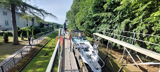 Dziś dzień pochylni! Już przed 8 rano byliśmy w maszynowni aby opłacić przeprawę oraz ustalić kiedy możemy podpłynąć pod wózek. Przed nami jedna biała flota i startujemy-8.30.