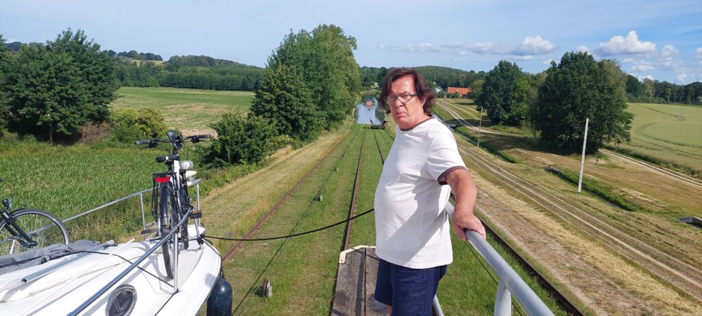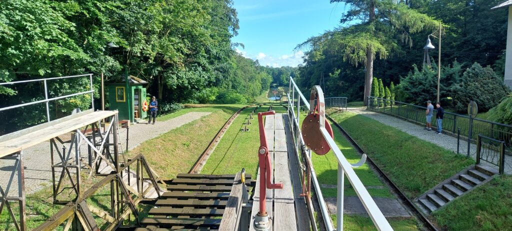 Po zmianie świateł na zielone wpływamy na wózek. Pierwszy i ostatni są bardzo wysokie bowiem pracują na styku jezior, gdzie zmienia się poziom wody, kolejne trzy są mniejsze. Zasada jest na wszystkich taka sama: żółty wystający hak to umowny granicznik dla dzioba – jeżeli stajemy z tyłu wózka – dla rufy-jeżeli stajemy z przodu. My wpływamy na przednią cześć więc żółty hak mamy na końcu trapu. To ustawienie jest ważne, bowiem w środkowej części wózka znajdują się dwie grubsze belki, które przy złym ustawieniu mogą uszkodzić silnik. Przeczytaliśmy w jakimś poradniku, że odległość burty od kładki powinna wynosić ok 10 cm i tak się ustawiamy. Podnosimy silnik. Trzymamy liny dziobowe oraz rufowe i walimy w gong. Wózek rusza. Źle obłożona cuma powoduje, że dziób nam odpływa więc znowu gong. Podchodzi obsługa, kilka wskazówek i ruszamy. Wydaje się, że mamy sukces. Jedziemy po torach w górę, podziwiamy konstrukcję i nagle jacht się z impetem kładzie. W tej pozycji dojeżdżamy do wody, powoli łódka wstaje, mamy nadzieję, że nie ma uszkodzeń. Przy następnej pochylni już wiemy, że po wpłynięciu na wózek Hook musi stać co najmniej około 50 cm od kładki, a najlepiej na środku wózka wówczas przy wyjeździe sam delikatnie się położy. I tak robimy. Na drugiej pochylni jest już łatwiej, można powiedzieć, że idzie nam już sprawnie. Łącznie pochylniami pokonujemy odcinek 9,6km.
