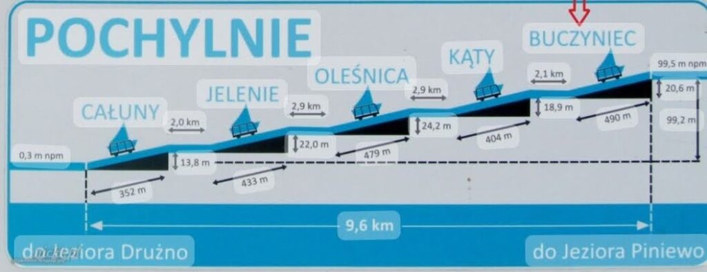 Buczyniec położony jest 99,5 m npm a ostatnia pochylnia Całuny 0,3 m npm. Tak więc dzięki pięciu pochylniom zniwelowana została prawie 100 metrowa różnica poziomów.