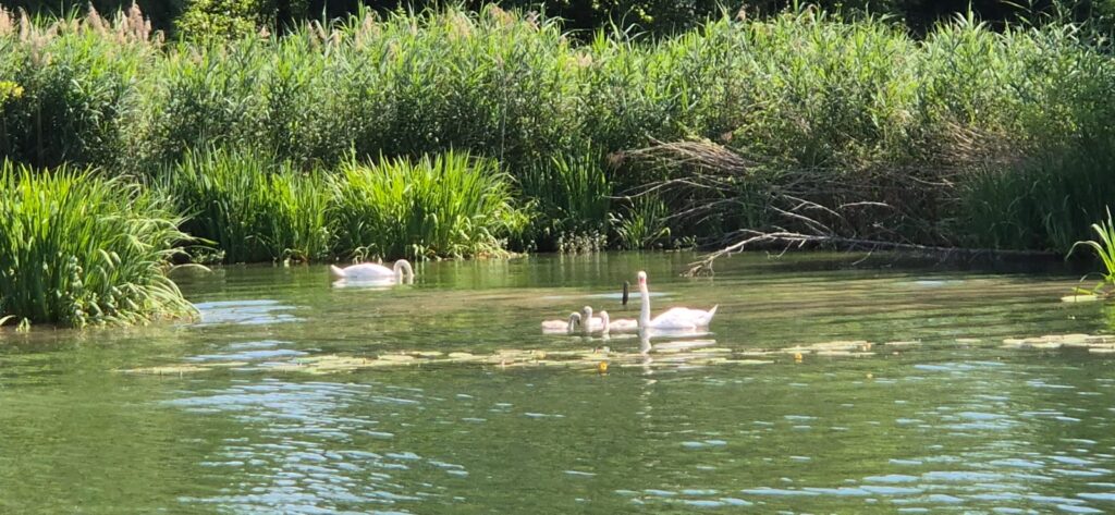 Śluzowanie tak jak wczoraj trwa strasznie długo. Siedem śluz zajęło nam łącznie 3,5 godziny. Na siedem śluz dwie są standardowe a pięć z pochyłymi ścianami i pływającym pomostem. Upał jest niemiłosierny. W słońcu ponad 40 stopni. W czasie kiedy trwa przerwa na lunch cumujemy przy malutkim pomoście i zażywamy kąpieli. Cała trójka.
