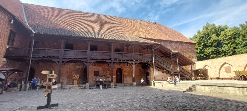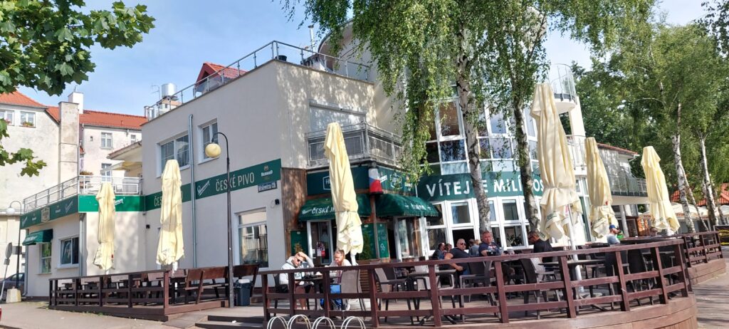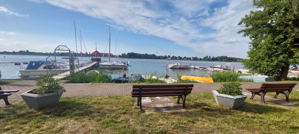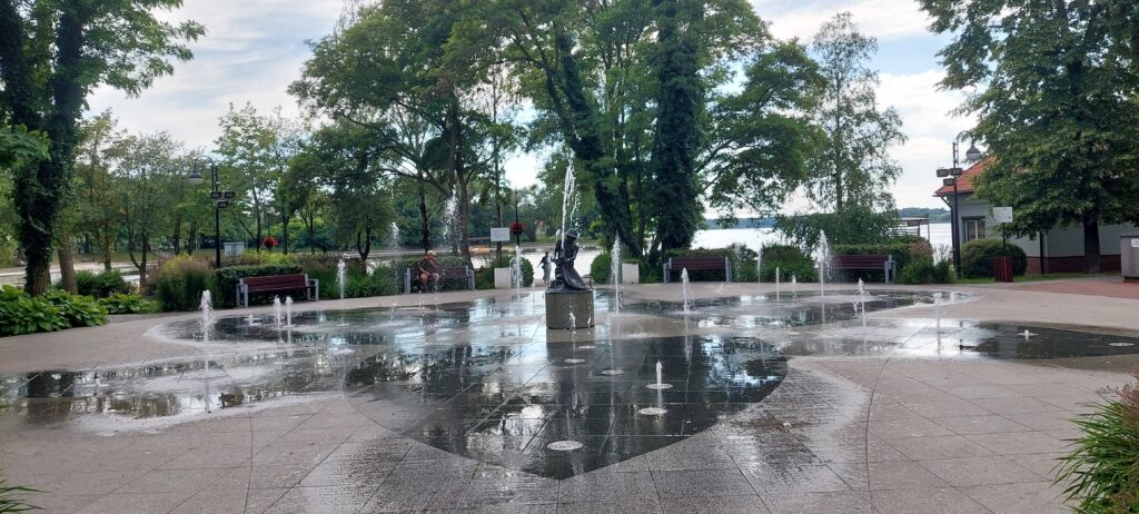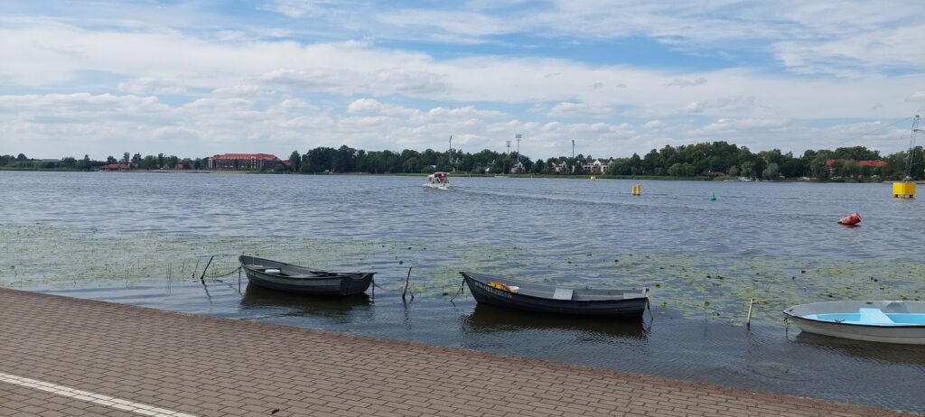 Dziś Ostróda liczy około 30 tys mieszkańców (podobnie jak Giżycko) i zachwyca turystów. Bulwary wokół jeziora są pięknie zagospodarowane. Nie zauważyliśmy wszechobecnych np. w Giżycku bud z tandetnymi pamiątkami Made In China. Zacumowaliśmy w porcie Klubu Żeglarskiego Ostróda więc przy samym deptaku. Keje chronione są przed nieproszonymi gośćmi za pomocą bramek na karty magnetyczne. Na jeziorze znajduje się ograniczony ogromnymi żółtymi bojami tor do jazdy na nartach wodnych. Udaliśmy się w kierunku przystani żeglugi pasażerskiej. Tuż za pięknym molo znajduje się świetna czeska restauracja Hospoda u Jezera, gdzie można zjeść tradycyjny czeski obiad w bardzo rozsądnej cenie. Ajra dostaje od razu na wejściu miseczkę z wodą. Po obiedzie udajemy się dalej na spacer – przed nami zamek krzyżacki gdzie znajduje się muzeum, dalej bulwarem do amfiteatru. Pięknie położony i zadaszony daje możliwość organizacji imprez bez względu na pogodę. Słynne są festiwale reggae oraz disco polo – nie wiemy tylko w jakiej kolejności ta sława 🙂 Obok amfiteatru biegnie aleja przyjaciół Ostródy gdzie swoją tablicę mają między innymi Czerwone Gitary. Wracając przechodzimy obok dużej miejskiej fontanny. Przy bulwarze znajdują się wypożyczalnie kajaków a w naszym porcie można również wypożyczyć rowerki wodne.