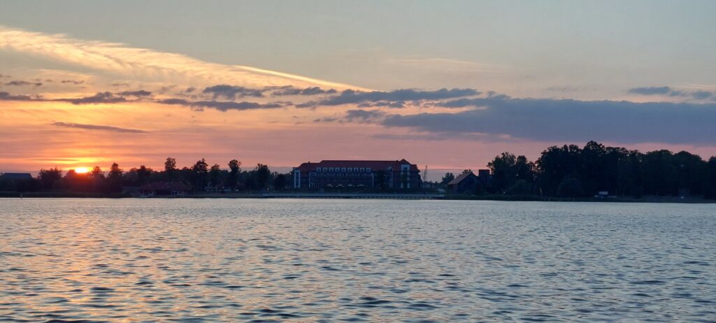 Z pokładu łodzi widzimy wieżę Bismarcka oraz okazały hotel Radisson. Obok naszego portu znajdują się jeszcze trzy – zajrzeliśmy do każdego i tu Ostróda w naszych oczach traci. Porty sprawiają wrażenie zaniedbanych, infrastruktura jest stara. Nie ma dostępu do wody z pomostu, w żadnym porcie nie ma też pomp do odsysania nieczystości. No dobrze, damy radę bez tej wody dzisiaj bo po pierwsze: widok z portu jest cudowny, po drugie jest mecz Polska -Turcja, ostatni przed ME. Opłaty za Hooka wynoszą 70 zł za port w tym prąd, prysznic 10 zł.