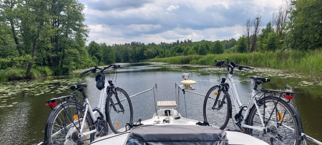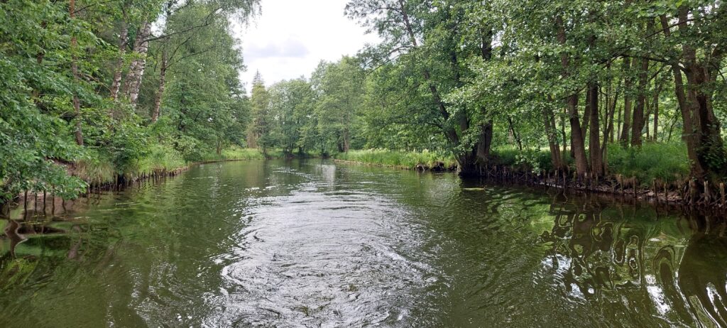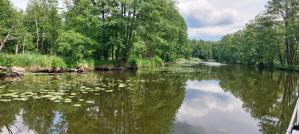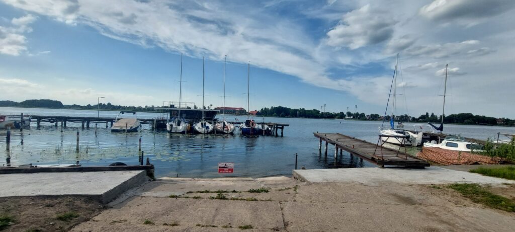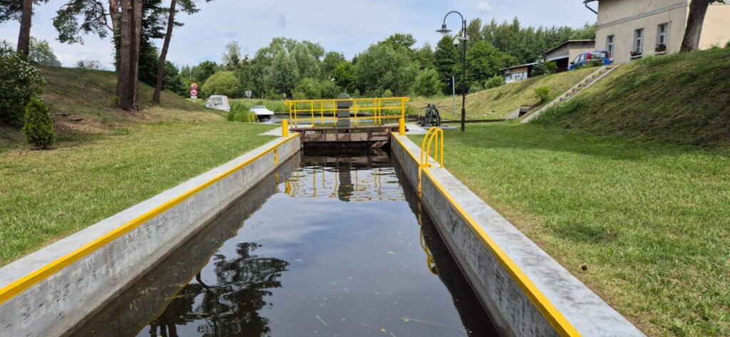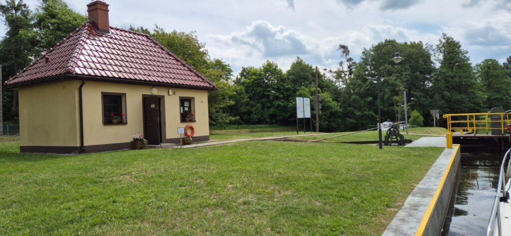 Okazało się, że w Miłomłynie w marinie było nieco płycej przy brzegu, ok. 70 cm. Wypływając zamuliliśmy nieźle śrubą. Skutek – zatkane odpływy silnika i brak wskazań prędkości i zaburzone wskazania kilometrażu. Po przedmuchaniu przewodu pompką od roweru udało się przywrócić prawidłowe wskaźniki. Na kanale jesteśmy sami, płyniemy z prędkością ok 7km/h. Głębokość w środkowym torze wynosi 1,5m a szerokość średnia ok 20m. Widoki zapierają dech w piersiach. Przed śluzą Zieloną jest rozwidlenie – należy płynąć prosto. Odnoga w prawo prowadzi do jazu – w razie pomyłki można tam zawrócić. Po wyjściu z kanału wpływamy na jezioro Drwęckie. Chcąc dopłynąć do miasta należy kierować się w stronę mostu na grobli na godzinie 11. Cumujemy w Klubie Żeglarskim Ostróda. Ostatnia marina po wpłynięciu do Ostródy i najlepsza. Prąd przy kei, w pozostałych nie ma nawet tego. Głębokość na początku kei 6 m, przy brzegu 1m. W porównaniu ze Szlakiem Wielkich Jezior Mazurskich cofamy się z infrastrukturą o 20 lat. Ale i tak jest cudnie.
