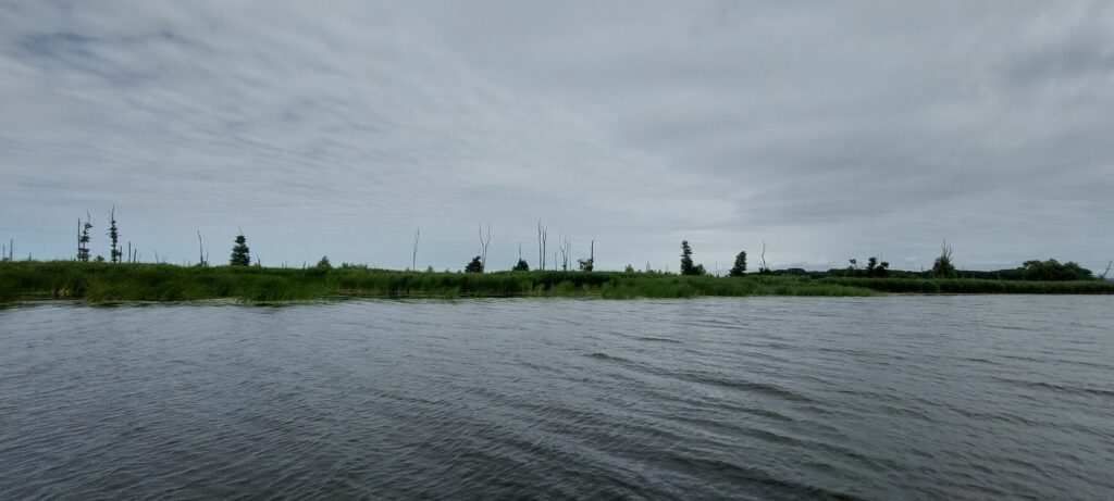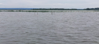Szybciutko tniemy po zalewie kierując się na południowy zachód do wejścia na Nogat. Po drodze mijamy ujście Wisły Królewieckiej do Zalewu i dużą ilość sieci rybackich więc nie ma mowy o jakichkolwiek skrótach. Pływanie po zalewie wymaga skupienia, nawet malutkie dziś fale sprawiały, że tyczki sieci były słabo widoczne z daleka, a sporo miejsc połowów oznaczonych było tylko zwykłymi patykami. Pławy mimo że na mapach wyglądają jakby stały w jednym rzędzie wcale tak nie stoją i czasem trzeba ich długo wypatrywać. Kierowaliśmy się na stawę Gdańsk i potem po pławach jak po sznurku do ujścia Nogatu. Mogliśmy płynąć Zalewem do ujścia rzeki Elbląg ale wybraliśmy w naszym przekonaniu ładniejszy szlak i niewiele dłuższy.