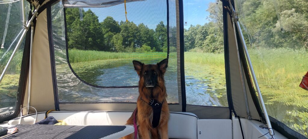 Przed nami Miłomłyn. Wody mniej o 20 cm, do przystani wchodzimy na wyłączonym silniku wciągani na cumach. Jest kilka łódek a na każdej pieski, małe więc mające bardzo dużo do powiedzenia. Ajra musi zostać na łodzi ale za to po obiedzie udajemy się na długi spacer. W Biedronce niedaleko portu uzupełniamy zapasy – najbliższe dni splanujemy spędzić w Chmielówce, gdzie nie ma sklepu.