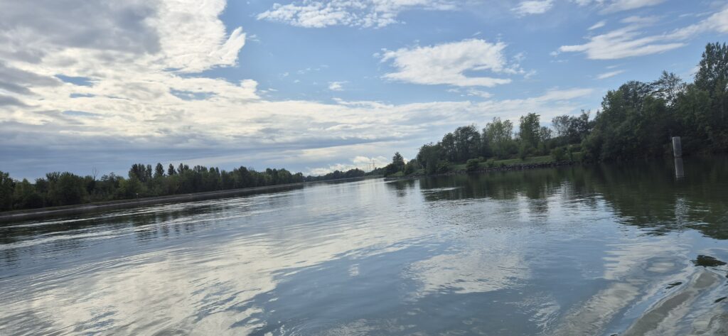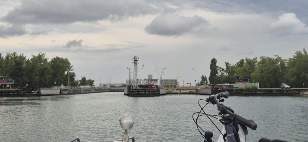 Kanał ma 150 m szerokości, głębokość 9 m i bardzo silny prąd. Po wyjściu ze śluzy płyniemy z prędkością 13 km/h przy spalaniu 4,5 l/h. Kolejne trzy śluzy również zaliczane są do kategorii gigantów, mają wymiary 183×22 m i na każdej opuszczamy się jakieś 12 m. Przed każdą musimy. też czekać na barkę ustępując miejsca większemu. Pomostów do oczekiwania na wejście brak, więc trzeba się kręcić w kółko w oczekiwaniu na „big ship”.
