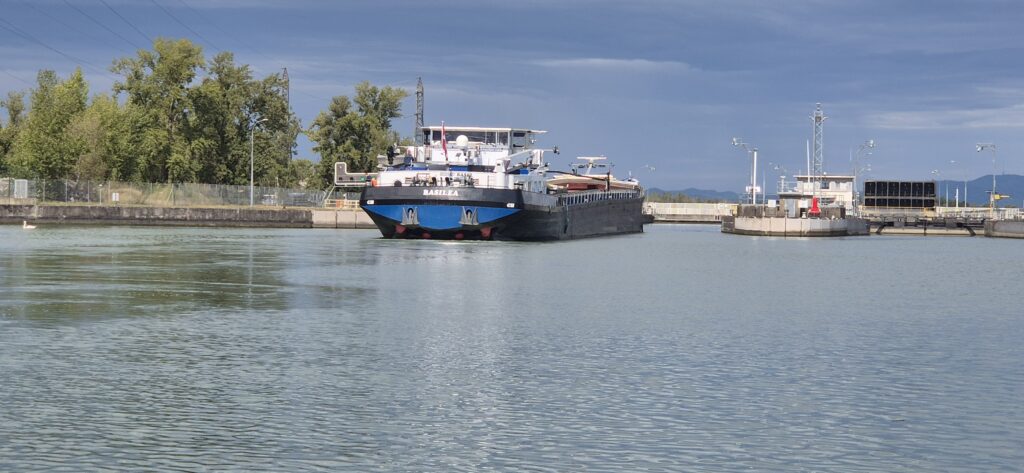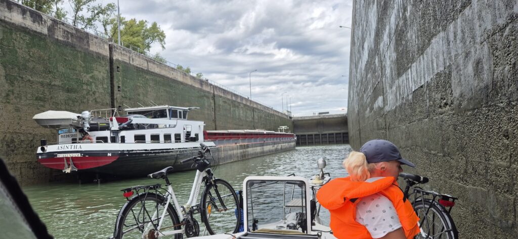 Zmierzamy do kolejnej śluzy, która pozwala wpłynąć na Grand Canal d’Alsace. Przed śluzą Niffer znajduje się mały port w którym pierwotnie mieliśmy stanąć ale z uwagi na wczesna porę podjęliśmy decyzję, że płyniemy dalej. Śluza Niffer ma już rozmiary przemysłowe 188×12 m i wchodzimy do niej jako druga jednostka ustępując pierwszeństwa barce. „Przemysłowa” jest również wysokość – opuszczamy się jakieś 12 m dwukrotnie przekładając cumę.