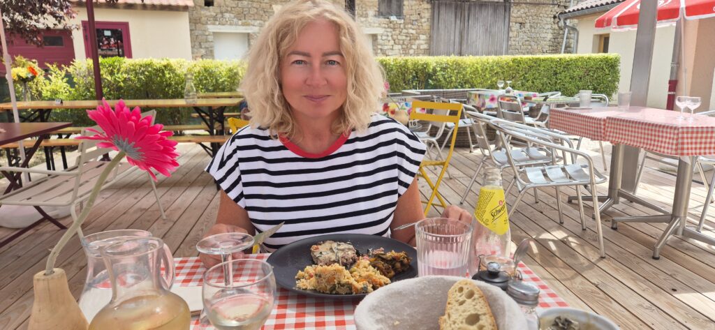 Tą właśnie trasą (między innymi) postanowił w tym roku popłynąć z południa Francji Joseph Diacoyannis. Wypłynął swoją barką z Sete ( gdzie będziemy) i obrał kurs na Sens ( gdzie byliśmy). Kiedy płynął Kanałem Burgundzkim na wysokości Fleurey zepsuło mu się sprzęgło i osiadł na mieliźnie. Najbliższy warsztat naprawczy znajdował się w Saint-Jean-de-Losne więc zamówił części i czekał. Po miesiącu postoju, kiedy nic nie wskazywało na poprawę sytuacji postanowił sam odholować swoją barkę do warsztatu. I tak idąc pieszo i ciągnąc ją za pomocą liny po miesiącu dotarł na miejsce. Niestety na kanale nie ma żadnego holownika ani mobilnej stacji naprawczej. Według żeglarza kanał jest „średniowieczny” – jest tutaj mnóstwo roślinności, są problemy z cumowaniem, brak jest miejsc z dostępem do wody i stacji benzynowych. I my tą opinię podtrzymujemy – jest pięknie ale pod względem infrastruktury wiele trzeba poprawić. Czy możecie sobie wyobrazić, ze holujecie swoją łódkę z Węgorzewa przez Giżycko, Mikołajki do Piszu bo po drodze nie ma warsztatu, który naprawi wam silnik? Taką drogę pokonał ów nieszczęśnik burłacząc swoja łódkę w XXI wieku we Francji. Nie głęboko w dżungli amazońskiej ale we wspaniałej Francji. Vive la France. Aż chce się żyć w Polsce. Późnym popołudniem zjedliśmy miły obiadek w restauracji. Był stek z tajemniczym, lokalnym sosem, sałatka i wino.