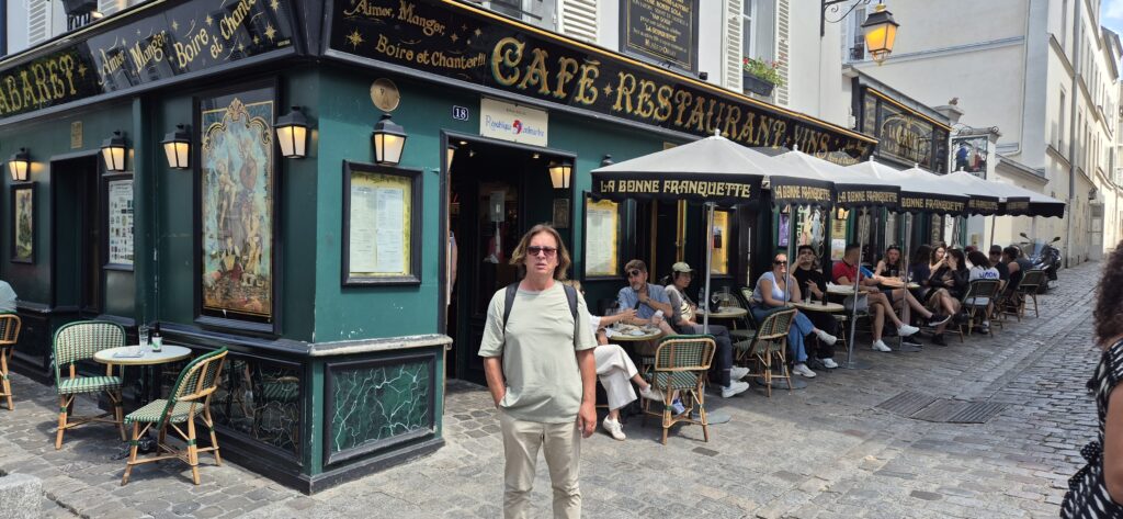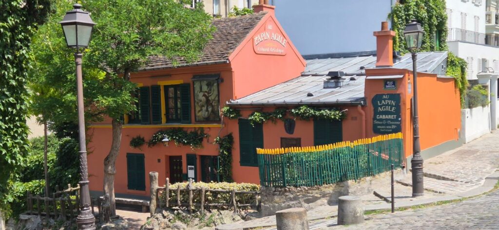 dąc uliczką w dół docieramy do słynnego kabaretu Lapin Agile, gdzie przesiadywał między innymi Picasso. Raz miał zapłacić za całodzienne jedzenie jednym ze swoich obrazów. Klub jest mały, niepozorny, na fasadzie znajduje się obraz królika. Czynny po 21. Najlepiej zrobić telefoniczną rezerwację. Według cennika na drzwiach wejście za 40 euro z drinkiem na osobę lub za 140 euro z butelką szampana. Niestety do 21 daleko. Ale usiąść na stołku gdzie siedział Picasso i przeżyć małe przedstawienie to byłoby coś. Może kiedyś się jeszcze uda.