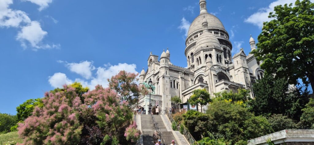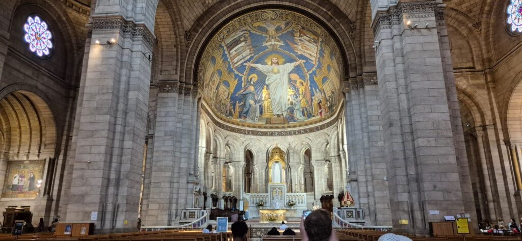 Zaczynamy od Bazyliki Sacré-Cœur, która położona jest na wzgórzu Montmartre. Jej biała sylwetka góruje nad miastem oferując piękną architekturę i panoramę Paryża. Aby do niej wejść trzeba ustawić się w sporej kolejce. Przemieszczamy się żwawo i po 15 minutach jesteśmy w środku. Wnętrze jest utrzymane w stylu minimalistycznym, przez co skupia uwagę na niemalże jedynej, ale wybitnej mozaice przyozdabiającej sklepienie głównej kopuły. Historia powstania bazyliki sięga czasów wojny prusko-francuskiej. Dwóch przemysłowców przysięgło sobie, że jeżeli po wojnie ujrzą Paryż takim samym jak przed wojną, to wówczas wybudują bazylikę. Jak powiedzieli tak zrobili.