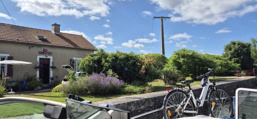 Dzisiejsze miejsce postojowe to wyremontowany port, który nie ma jeszcze podłączonej infrastruktury i położony jest z dala od różnych chateau i innych atrakcji. Wyglądało na to, że będziemy dziś bez prądu co przed jutrzejszym dniem nie napawało optymizmem. Jutro 42 śluzy. Bez sprawnych sterów strumieniowych (bocznych) byłoby to bardzo niekomfortowe. Ale zauważyliśmy, że obok portu stoi podłączony do prądu kamper. Kapitan udał się do pobliskiej firmy do której zmierzał kabel z tego kampera i po dość długiej ale skutecznej rozmowie mieliśmy prąd za 10 euro. Uratowani. Do sklepu majtek jedzie rowerem aby zrobić zaprowiantowanie na dwa dni gdybyśmy przypadkiem utknęli między tymi 42 śluzami.