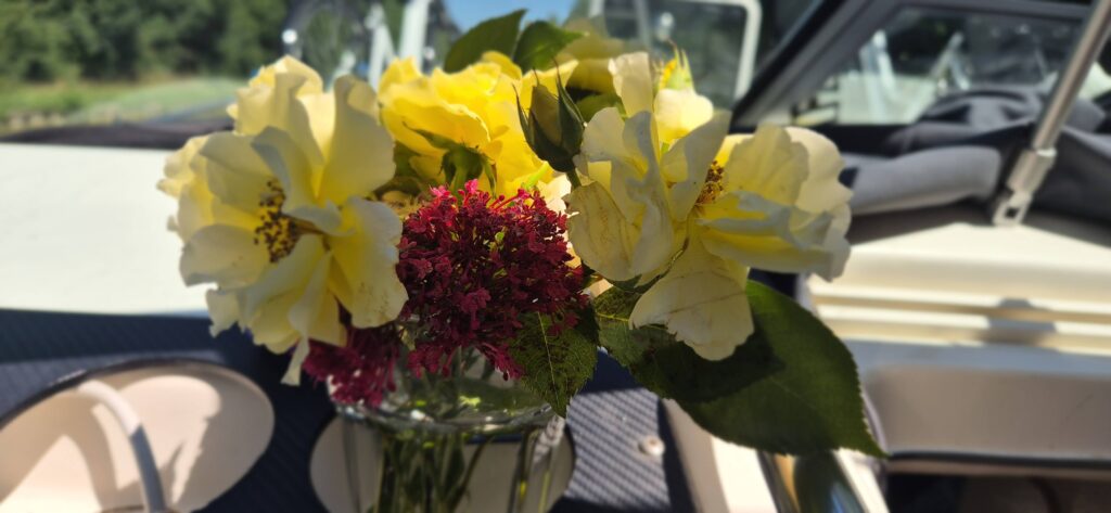 Dzisiejszy odcinek zmęczył nas okrutnie a to przedsmak tego co czeka nas kolejnego dnia. Perfekcyjnie zamontowane odbijacze (w nowych, nie do końca oczywistych miejscach) robią swoją robotę na śluzach. Dobrze dobrany team śluzowych to gwarancja przejścia śluzy maksymalnie w dziesięć minut. Nie zawsze jednak tak jest i kiedy operator jest jeden trzeba wyjść i też pokręcić. Od drużyny śluzowych, która płynie z nami do Venarey majtek dostaje piękny bukiecik kwiatów. W przerwie między korbkami zerwali i ułożyli. Urocze prawda?