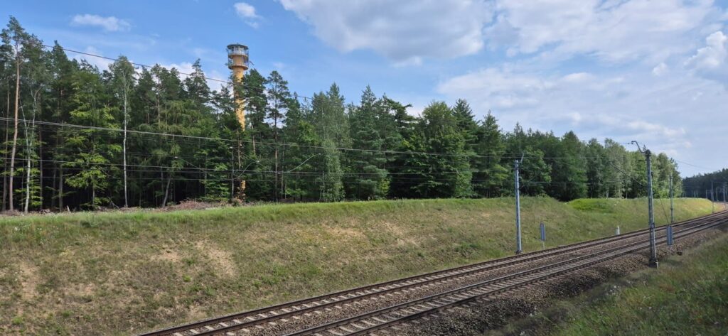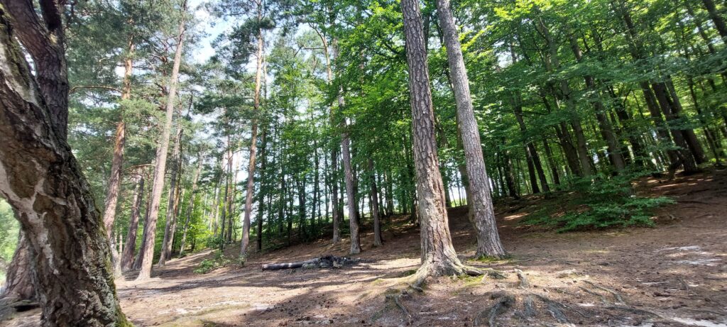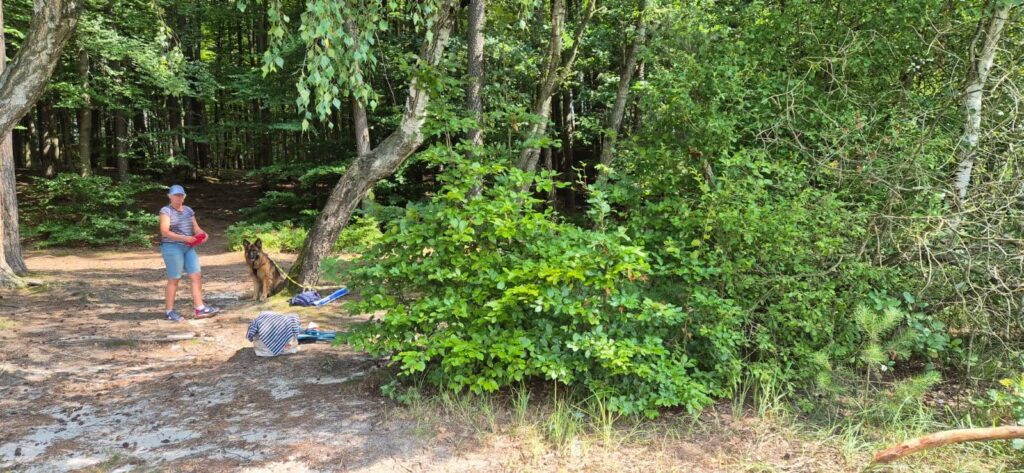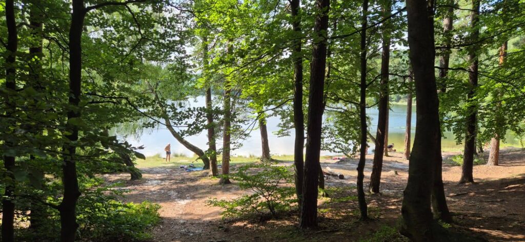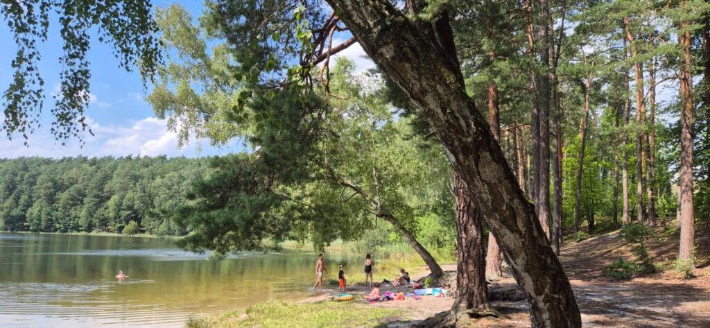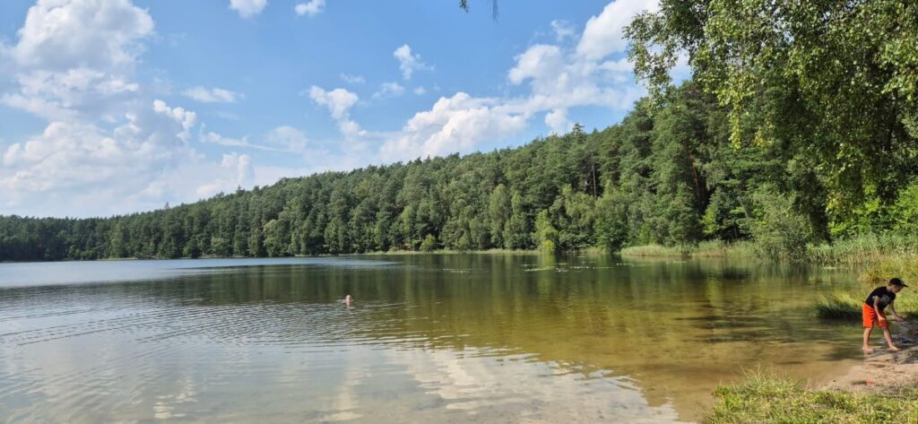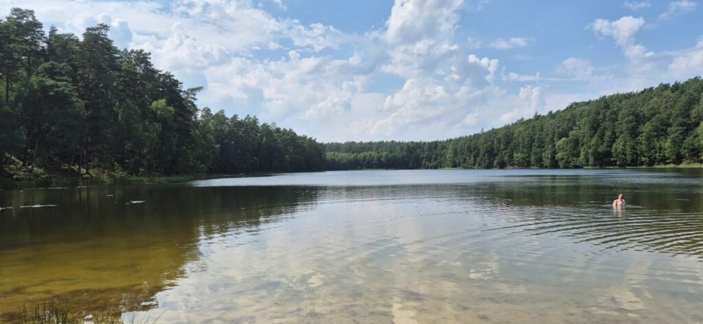 Według prognoz pogody temperatura wyniesie dzisiaj 32 stopnie – to znak, że musimy uciekać z łodzi już po śniadaniu. Szukaliśmy miejsca, gdzie można poplażować z psem, gdzie nie będzie zbyt wielu ludzi. Za namową bosmana udajemy się nad jezioro Silim jednak nie jest to to czego oczekiwaliśmy. Możemy polecić to miejsce na spacer bowiem od parkingu do brzegu jeziora prowadzi ścieżka edukacyjna. Wiata jest w mocno zacienionym miejscu, nie ma plaży jako takiej ale jest zejście do wody. Decydujemy się na plażę nad jeziorem Czystym (Głębokim), która oddalona jest 11km od portu. I tutaj zaczyna się przygoda. Droga dojazdowa jak przystało na wakacyjną porę jest w remoncie i wytyczony jest objazd przez las. Szlak wskazują tylko małe kartki na słupkach, jedziemy leśną drogą pełną kolein i jest pięknie. Dodatkowym atutem jest działająca w samochodzie klimatyzacja. Dojeżdżamy na miejsce gdzie powinniśmy przejechać przez torowisko i witają nas robotnicy lejący asfalt. Wracamy i odnajdujemy leśny dukt prowadzący w stronę jeziora. Stajemy pod wieżą przeciwpożarową i pędzimy nad jezioro. Droga biegnie przez las.