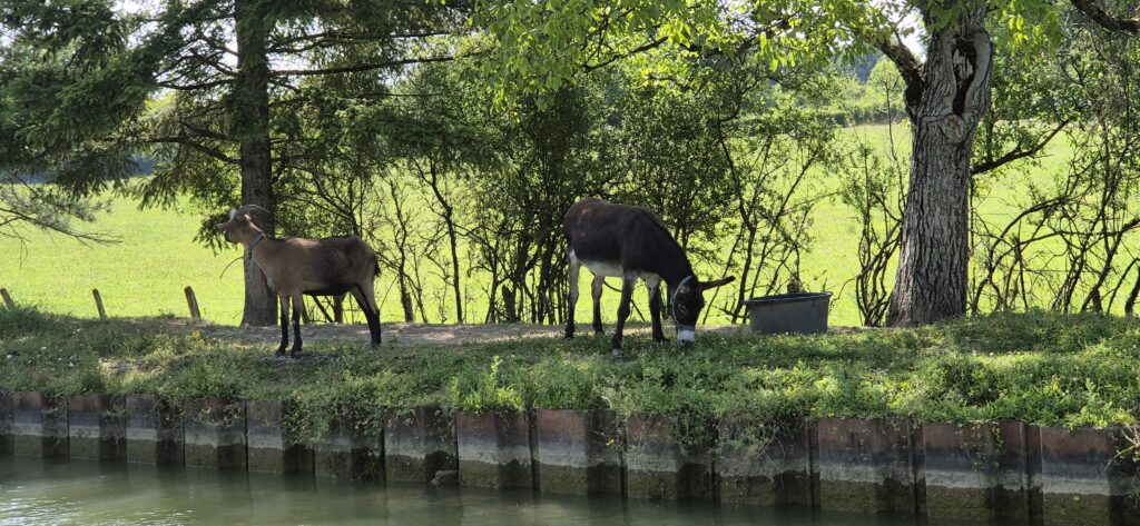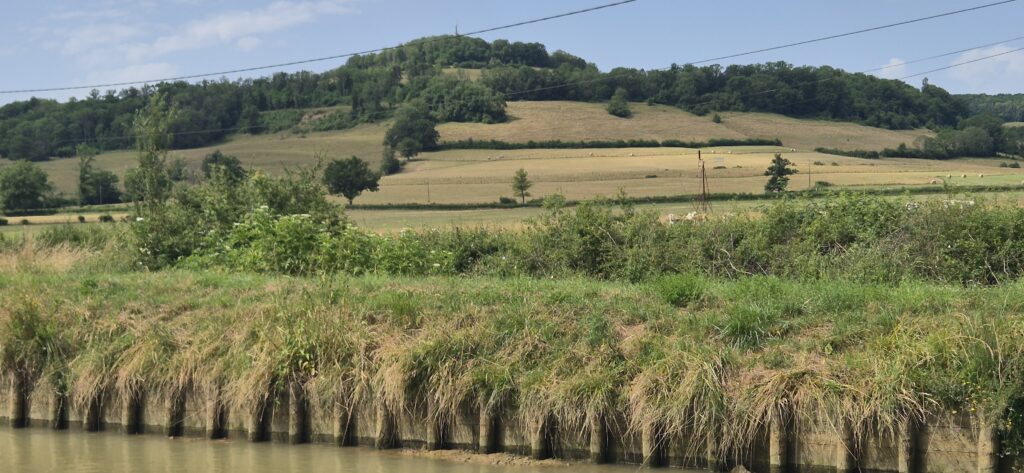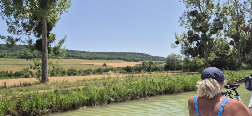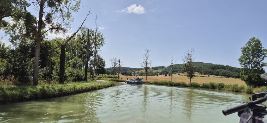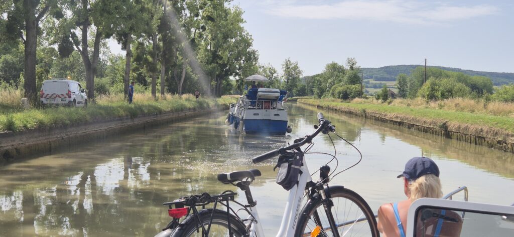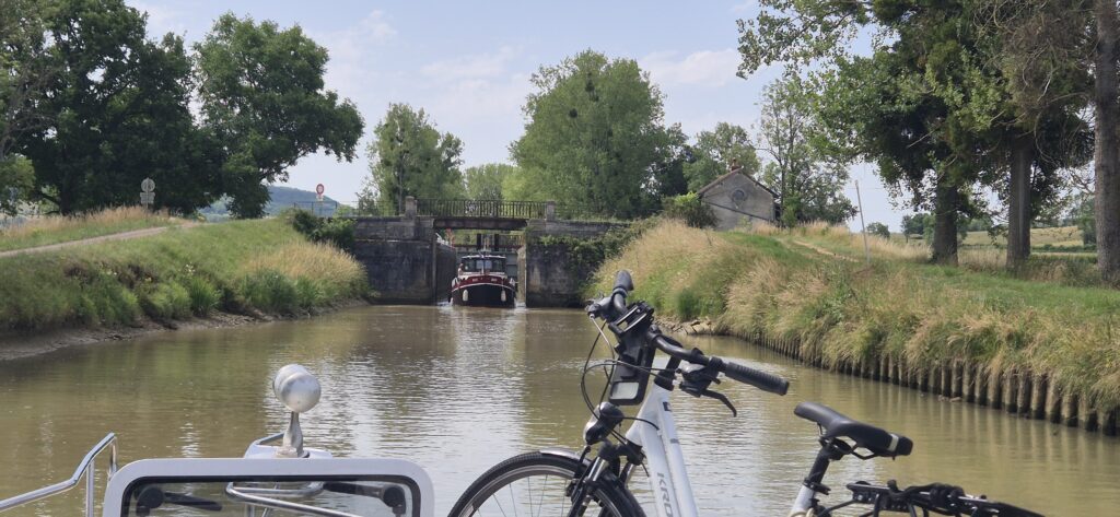 Po pięciu śluzach następuje zmiana obsługujących i płyniemy dalej. Wszystko idzie sprawnie a ku naszemu zaskoczeniu nawet przerwa obiadowa zostaje skrócona do trzydziestu minut. W klasyfikacji najgorszych dni w czasie naszego rejsu dzień dzisiejszy zajmuje trzecią lokatę po Oosterschelde i Westerschelde w Holandii. Jest bardzo ciepło: każdy nasz termometr pokazuje inne odczyty ale według google mamy 34 stopnie. Śluzy są w bardzo małych odległościach od siebie-200 do 300 metrów, tak że wypływając z jednej już widać kolejną. Wszystkie obsługiwane są ręcznie i w każdej podnosimy się na taką samą wysokość ok. 2,5 metra. Płyniemy cały czas bez żadnych przerw (oprócz tej lunchowej). Odcinek od Vanarey do Pouilly to jeden z najbardziej wymagających odcinków Kanału Burgundzkiego. Różnica wzniesień na trasie o długości 35 km wynosi 85 m.