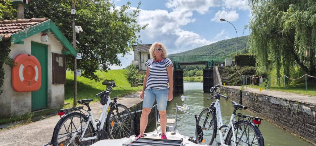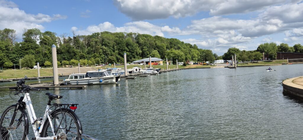 Stajemy w Le Chesne na halte fluviale. Jest jedno wolne miejsce i do dyspozycji tylko prąd. W sezonie trwa chyba walka o miejsca postojowe bowiem wcześniej w tej okolicy nie ma innych miejsc a to ostatni przystanek przed wejściem do „doliny śluz”. Ta atrakcja czeka na nas jutro – na odcinku 8 km znajduje się 29 śluz a różnica poziomów wynosi 85 m!