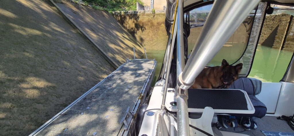 Wypływamy po ósmej póki jest jeszcze jest w miarę chłodno. Pierwsza śluza powoduje naszą konsternację – jest jak wanna, ze skośnymi ścianami i bez możliwości umocowania się do czegokolwiek. Trzeba wpłynąć i starć się aby podczas zmiany poziomu wody nie uszkodzić łodzi. Takie atrakcje zapewnią nam jeszcze dwie kolejne. Można co prawda z pomocą śluzowego zacumować ale niechybnie burta i dno będą ocierać się o szorstki, nierówny kamień. Zdarzają się podobne śluzy w Polsce ale mają na ścianach poprzeczne drewniane belki chroniące łódź. Będą też dwie, na których ktoś pomyślał o małych łodziach i dostawił mały pomost na szynach, który unosi się na wodzie wraz z łodzią. Na dzisiejszym odcinku ewidentnie jest jakiś kłopot bowiem wszystkie światła są wyłączone a bramy otwiera nam pracownik VNF. Cały czas płyniemy rzeką Yonne, która jest dopływem Sekwany. Jest tylko nieco węższa, 100-150 metrów. Nie ma natomiast problemu z głębokością. Podobnie jak na Sekwanie głębokość w nurcie to 3,5- 4 metry. Przy brzegach nie mniej niż 2-2,5.