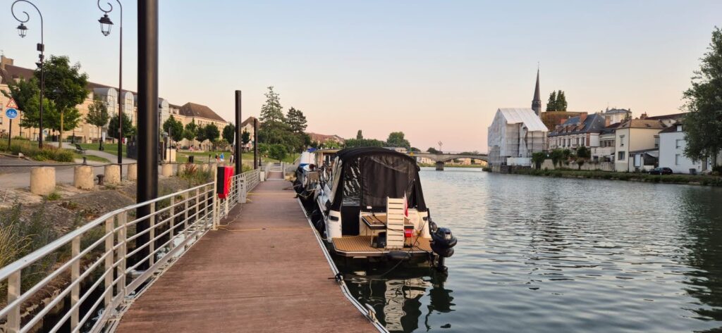 Na nasze halte fluviale docieramy około 16. Jest podobnie jak wczoraj: pomost ze słupkami zlokalizowany koło promenady. Prąd i woda są na specjalne żetony (są darmowe), które są do odbioru w informacji turystycznej oraz wybranych placówkach takich jak piekarnia, stacja benzynowa czy kawiarnia. Takie miejsca postojowe nie należą do naszych ulubionych bowiem cały czas ktoś się kręci wokół łodzi. Upały sprawiają, że każdy szuka ochłody a deptak nad wodą idealnie się do tego nadaje. Tym razem mamy sąsiadów bowiem na pomoście stoją już dwie barki