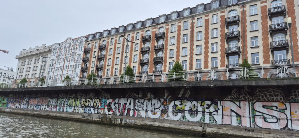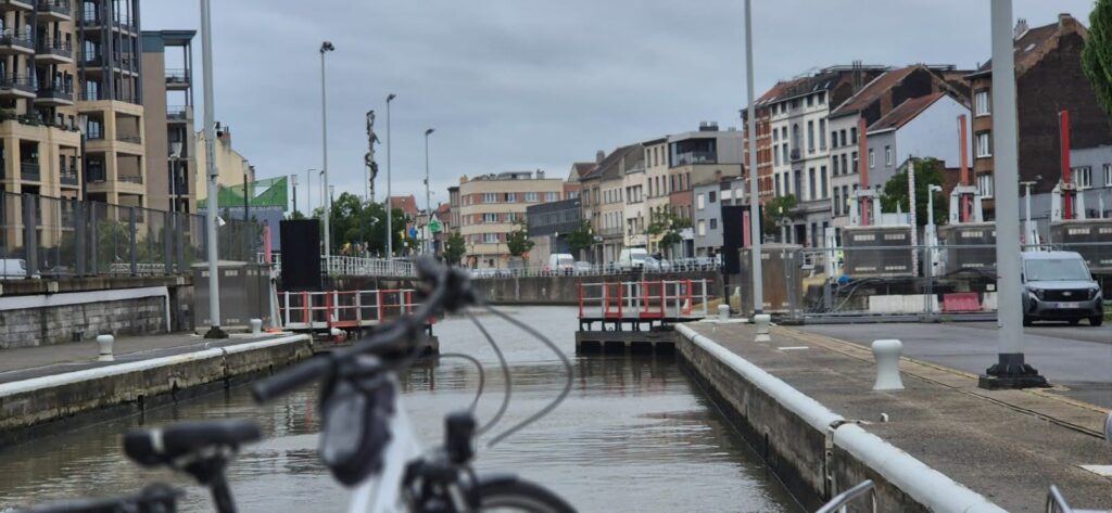 Na dzisiaj kapitan Huk zaplanował nocleg w Ittre, już w Walonii a po drodze machniemy siedem śluz. Płyniemy kanałem Bruksela – Charleroi. Ma szerokość średnio 50 m i głębokość 4-6 m. To bardzo ważny dla Belgii kanał bowiem łączy stolicę z przemysłowym regionem Charleroi. Powstał w XVIII w. i służy głównie do transportu materiałów budowlanych, węgla, paliwa i złomu. Jaki transport takie widoki. W początkowym odcinku w aglomeracji Brukseli płynie się w otoczeniu wysokich na kilka metrów murowanych brzegów a szerokość potrafi zmniejszyć się nawet do 30 m… jak mijają się barki skoro my musieliśmy bardzo zwolnić i usunąć na bok przy spotkaniu z taką jednostką? Śluzowanie nie pierwszyzna ale w deszczu mało przyjemne. Trzy pierwsze udało się pokonać w przerwach między opadami a kolejne w kąpieli wodnej. Angielski pracowników śluz raz bezproblemowy, innym razem little problem. Ale daliśmy radę.