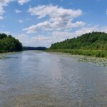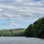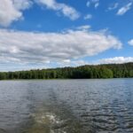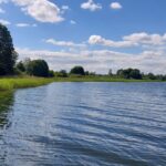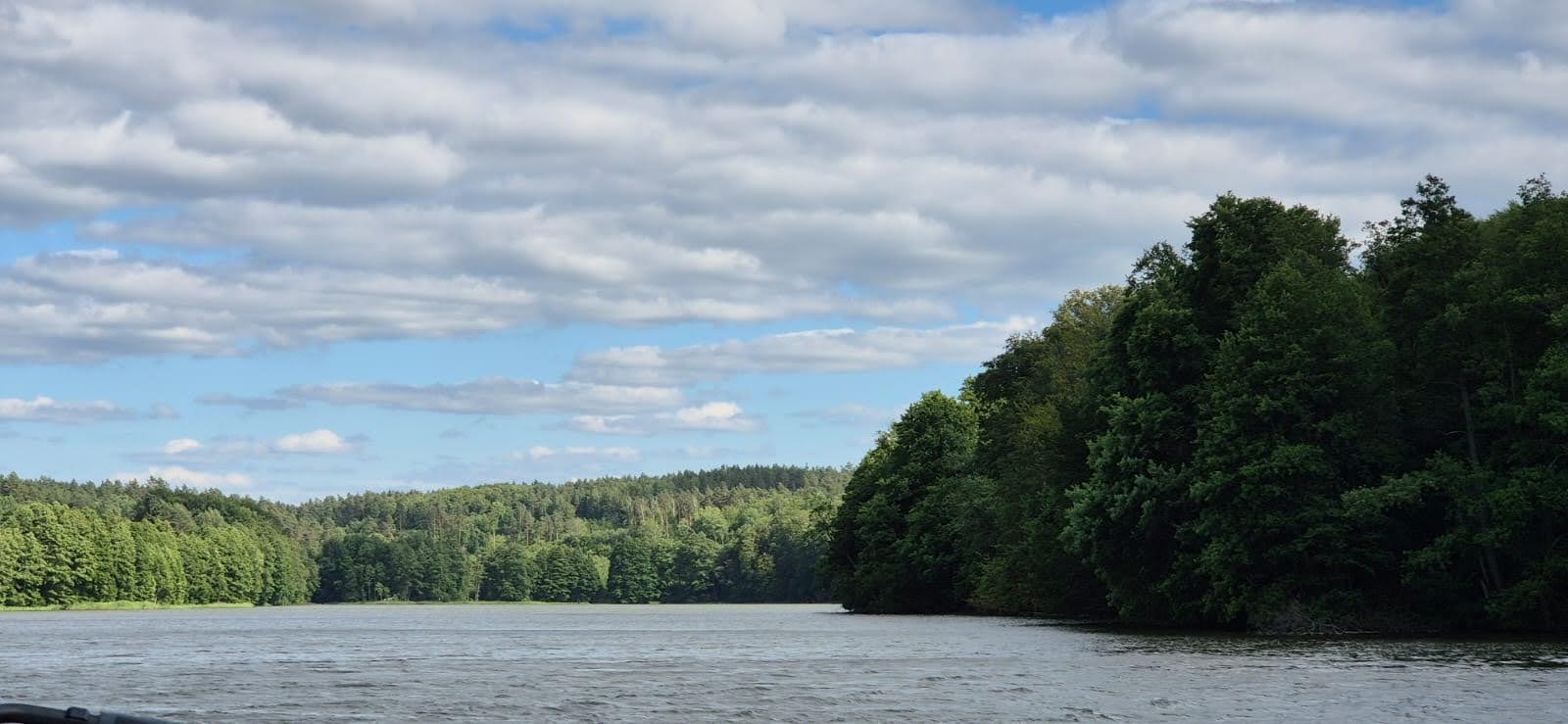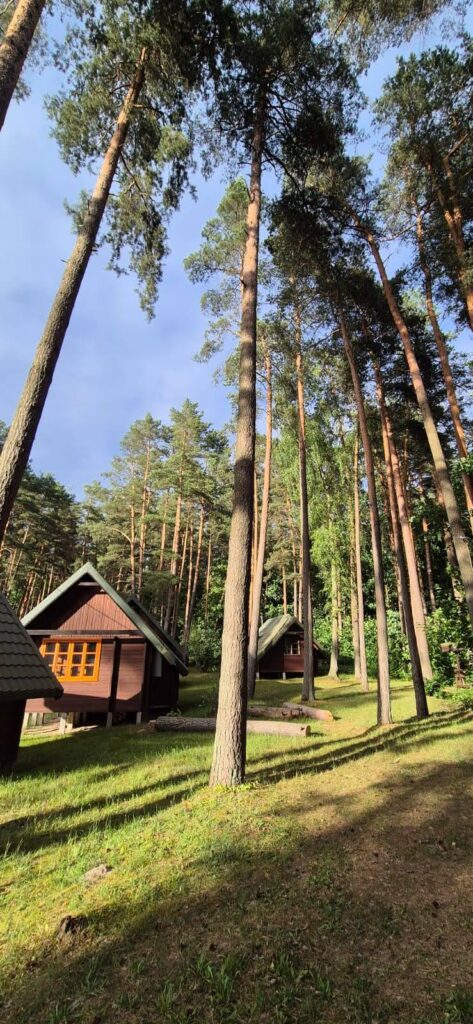 W ośrodku są drewniane domki, jedne w lepszym standardzie inne mają tylko drzwi, malusieńkie okna a wewnątrz dwa tapczaniki. Toalety bardzo skromne. Ale za to na terenie ośrodka rosną (tak nam się wydaje) sosny Taborskie. Sosna jak sosna można by rzec ale nie w tym wypadku. Ten gatunek sosny jest bardzo strzelisty, elastyczny, ma gładki pień i idealnie nadaje się do budowy masztów. Interesował się nim Napoleon, który nakazał wysłać olbrzymie ilości drewna i nasion do Francji. Drewno z tych sosen posłużyło również do odbudowy Teatru Narodowego w Warszawie zniszczonego w czasie wojny. 14 km od portu znajduje się Rezerwat Sosny Taborskiej jednak my się tam nie udamy bowiem jutro wracamy do Miłomłyna.