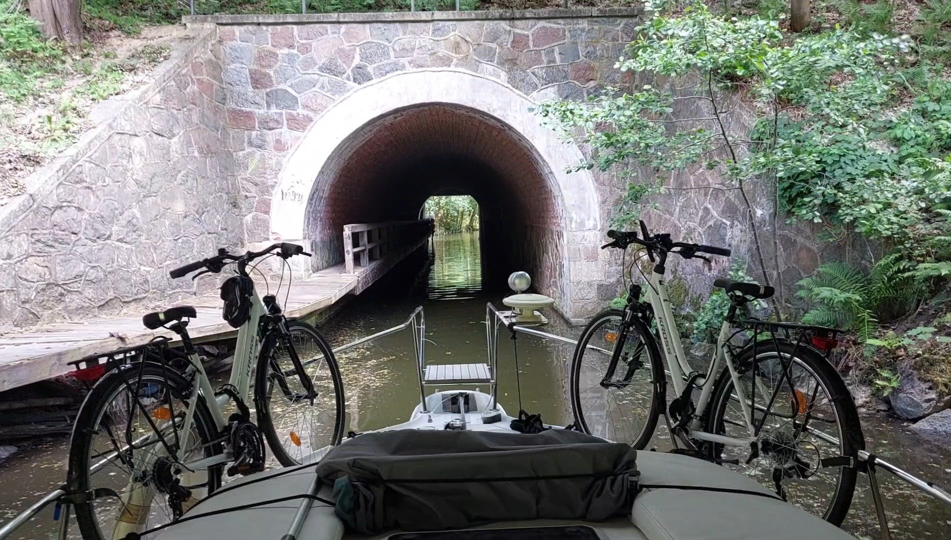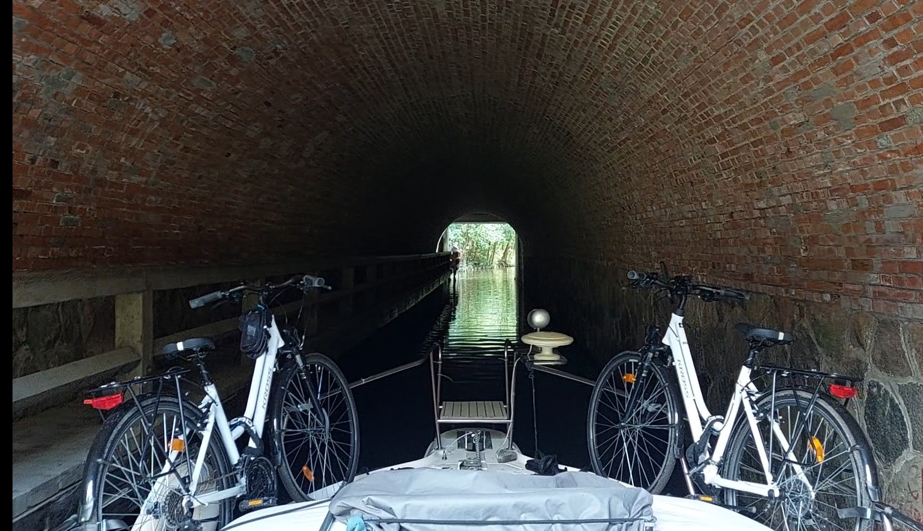 Przed nami jezioro Wielki Szeląg i pierwsza od momentu wyjścia z portu jednostka pływająca – surfer. Jeziora Szeląg Wielki i Szeląg Mały łączy kanał, który nagle zamienia się w tunel żeglugowy. Tunel powstał kiedy budowano linię kolejową Toruń-Olsztyn, która miała przeciąć jezioro. W jego przewężeniu usypano groblę i tak górą jeździły sobie pociągi a dołem przez wymurowany tunel żeglarze. Dla turystów pieszych wybudowano w tunelu kładkę. Tunel ma dokładnie 54m i jest w nim naprawdę ciemno.